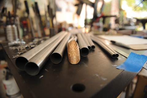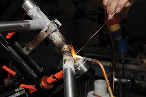 There are a handful of methods for joining metal tubing, but Jung usually opts for fillet brazing. With this method, joints are created by melting a bronze rod around the tube junctures. This bronze loop is called a fillet, French for “ribbon.” More time-consuming than welding, lower-temperature brazing requires only a blow torch, and not a TIG welder, keeping Jung’s start-up costs lower. It takes a lot of practice to control one’s blowtorch in order to maintain consistent temperature and to create fillets that are structurally sound. Before he ever built a bike, Jung brazed hundreds of pieces of scrap tubes together. Then he would saw the fillets in half to examine their cross-sections. Many builders, like Jung, like to file their fillets so that when the bike is painted, there is a seamless transition between tubes.