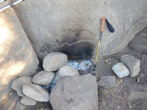 Hiking through Rattlesnake Meadow (aka “Tin Can Flat”) early Sunday morning with a friend, we found evidence of a campfire with 18-inch-high, black burn marks on the boulder behind it. We had been through the area on Friday but no campfire remnants were there at the time. A large wooden sign at the beginning of Rattlesnake Canyon forbids firearms, mountain bikes, overnight camping, and campfires or fires of any sort.