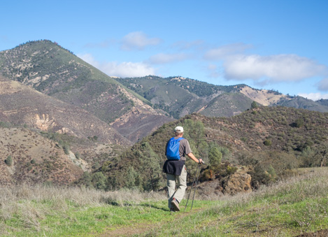For the next hour past the Lover’s turnoff, Ben leads me through an absolutely wonderful selection of open meadows, oak forests, small side drainages and high country, ups and downs and ins and outs to a point where we reach an open area directly across from Grass Mountain. Magic. At times we follow cow trails; at others we work our way through chaparral thickets and or meandered off trail through the acres of grassy hillsides. Amazingly, through we are paralleling Figueroa Mountain Road perhaps a hundred feet of elevation below it, there is never a sense that we were near the road.