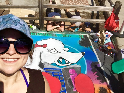 The Angry Poodle may not be everyone’s idea of the Madonna, but plenty of people walking by our pocket of i Madonnari last weekend immediately recognized her. One, when persuaded Trixie was a “she,” remarked with arched brow, “Oh, she’s a real b!#@$.” Then there was the kid who strolled by saying, “That’s not the best drawing.” But it was really fun, sales rep Rachel Gantz (who’s taking this selfie) and ad designers Alex Melton and Marianne Kuga agreed, even with the too-hot-to-touch asphalt and sunburns.