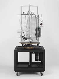 The “Light Prop,” which has been re-created in facsimile for this exhibition and is on display in the museum’s Emmons Gallery, is one of those utopian projects that were intended to render all previous artistic media obsolete. A mechanical assemblage of metal, glass, and plastic, it is programmed by a primitive “switchboard” to spin, glow, shimmer, and flash in an unending set of variations intended to engage anyone within its firing range in an immersive aesthetic experience.
