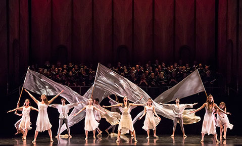 The production portrayed the lyrics of Carmina Burana. with a literal Conan the Barbarian, medieval flavor that featured hooded monks emanating creepiness, court jesters, priests, frolicking court dancers, football-field-length dance streamers, and, of course, the choir waving Roman-chariot-like celebration ribbons for the “O Fortuna” finale. The photo-finish highlight of the work, however, was a Théodore Géricault’s The Raft of the Medusa–inspired 12th movement “Olim lacus colueram,” where the beautiful swan glides with melancholy across the stage upon a bench-made-raft platform, to be swarmed, picked, and eaten by a bunch of savages. O fortuna…