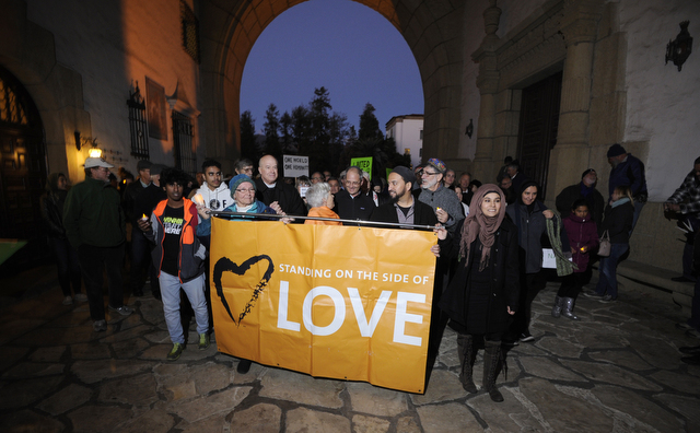 Carrying a banner that read, “Standing on the side of love,” Santa Barbara leaders from the Islamic, Jewish, Hindu, and Christian faiths led “Not In Our Name,” an interfaith peace walk and candlelight vigil for the victims of the San Bernardino shooting. The Monday night walk from the county courthouse to De la Guerra Plaza united nearly 200 interfaith community members who, like SBCC Admissions Advisor and Muslim Akil Hill, were there “to stand in peace.”
