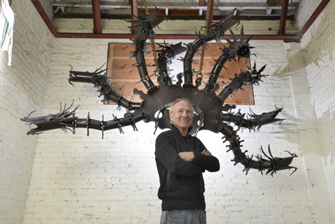 Meanwhile, unsuspecting Santa Barbarans got an impromptu preview of the gates last June. The occasion was the Solstice Parade, and Shelton, whose studio is in the heart of the warm-up area, was urged by his friends at Solstice to incorporate the element he has built — his massive hydra — into the parade. In the prospectus for the CAW gates, Shelton reveals himself a man of paradoxes. “While his sculpture tends to be minimal and spare, his architectural ironwork is usually playful,” read the proposal. This creature with its nine heads had to be loaded by crane onto a metal cart with casters strong enough to roll it out. It is neither minimal nor playful, though it is dramatic fun. What was more entertaining, though, was watching Shelton, family, and crew roll the behemoth up the street behind a group of scantily clad dancers. It took eight sets of arms and legs. They pushed the giant up the street laboriously; most Solstice floats only look heavy, with papier-mâché foam and cardboard as the materials of choice. Coming right behind the dancers, the sweating pushers with their gigantic mythic monster made a lot of people scratch their heads. “And one kid pointed up and said, ‘Look at the hydra,’” Shelton said. It left him happy and speechless.