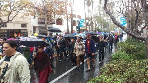As the group set off to Arlington Theatre, State Street businesspeople poked their heads out of offices and lined the sidewalk to watch the passersby, clapping and singing along to Civil Rights songs and a timely variation of “We Shall Overcome” as “We’ll March in the Rain.”