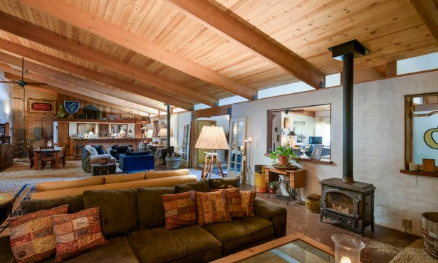 The gated entrance leads through an avocado orchard to the first of two separate three-bedroom/two-bath homes. The houses themselves are light and airy, with a contemporary feel and lots of windows to take in the private mountain views. They also both have covered porches and decks, providing lots of outdoor seating areas. In addition, pathways meander through the grounds and lead to distinct areas like a pond and a fire pit with benches. The carefully landscaped grounds are a mix of both indigenous and exotic plants and trees, but the property still feels wild and close to its natural state.