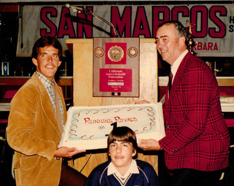 Halleck was coach of the Royals for 23 seasons, compiling a record of 341 wins and 202 losses. His 1980-81 team made history. Known as the Runnin’ Royals, they played a pressing, up-tempo game that was engineered to near perfection by a lineup of seniors who had played together for years. They racked up 26 straight wins and reached the ultimate prep championship game in Southern California: the CIF 4A final against Long Beach Poly. San Marcos had a 14-point lead at one time, but at the end Poly prevailed, 65-63.