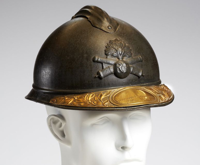 But as bolt-action rifles, capable of firing 15 rounds a minute at ranges up to 2,000 feet, became common, soldiers began digging holes to hide from enemy fire — trench warfare was born, and with it, an increase in head injuries and shell shock. So steel helmets, some weighing upward of four pounds, were introduced in 1915. “It’s no longer this glorious war,” said Lee. “Now people are hiding in trenches. These objects are an attempt to tell the story of the short, glorious war that became a longer war with artillery, mass production, and bloody warfare.”