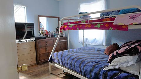 To the right of the living room is one of the two bedrooms. Bunk beds demonstrate that two kids could easily make it work as a room to share. Down the hallway is the bathroom, with the other bedroom beyond. From this same hallway, I stepped into the kitchen, which also has big windows and a door out to the backyard. White tile in the kitchen, on the backsplash, walls, counters, and even the floors makes for a bright, clean palette that magnifies the spaces.