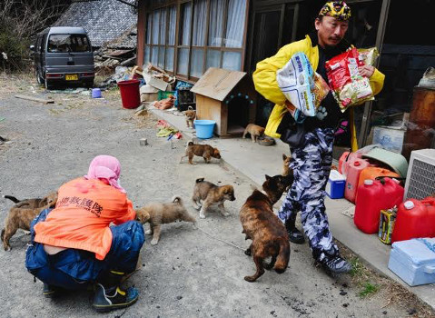 The rural Fukushima area was evacuated on March 12, 2011. When residents were woken up in the middle of the night and told to board buses, destination unknown, they were told not to bring personal belongings, including their pets. Thinking they would return soon, pet owners left two or three days’ worth of food and water. Some owerns tied their animals up; some let them run loose. The residents never returned. The animals that were tied up perished.