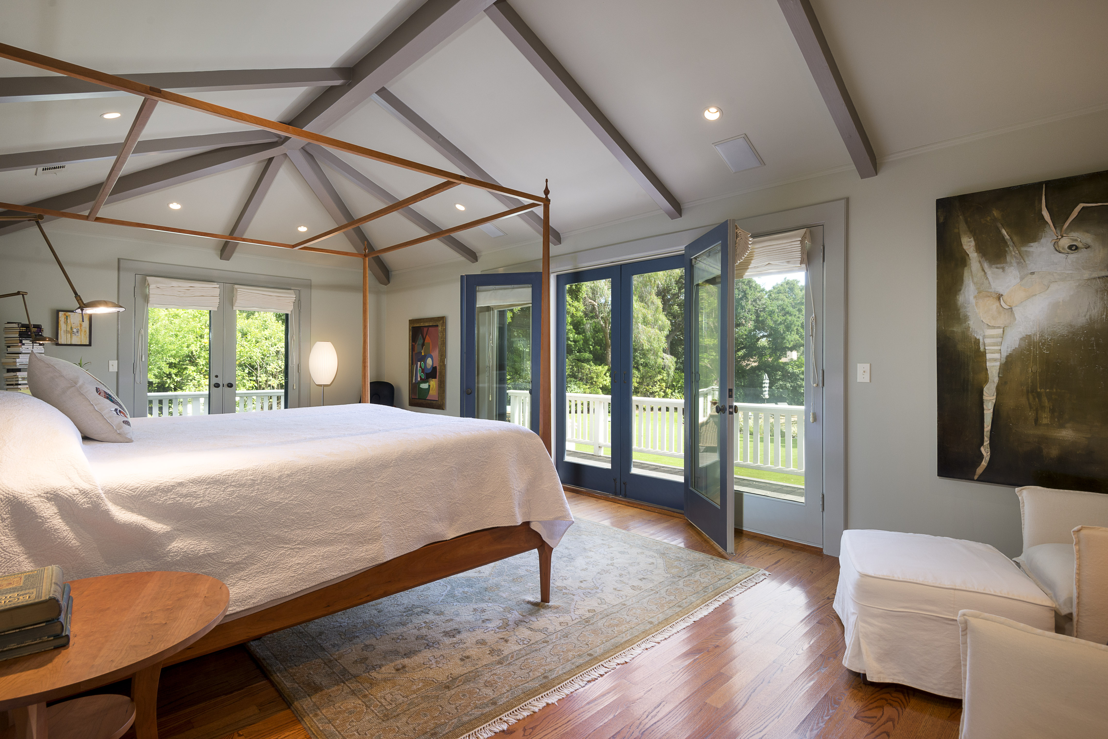 Down a short hallway, one enters either directly into the master bedroom or via a clever pocket door through the walk-in closet that’s one of the largest, most well laid out I have seen. The master bath has an additional gorgeous claw-foot tub, a separate glass-enclosed shower, and gleaming white, custom cabinetry. The bedroom itself is airy and spacious, with beamed cathedral ceilings and three sets of French doors that open onto a wraparound porch.