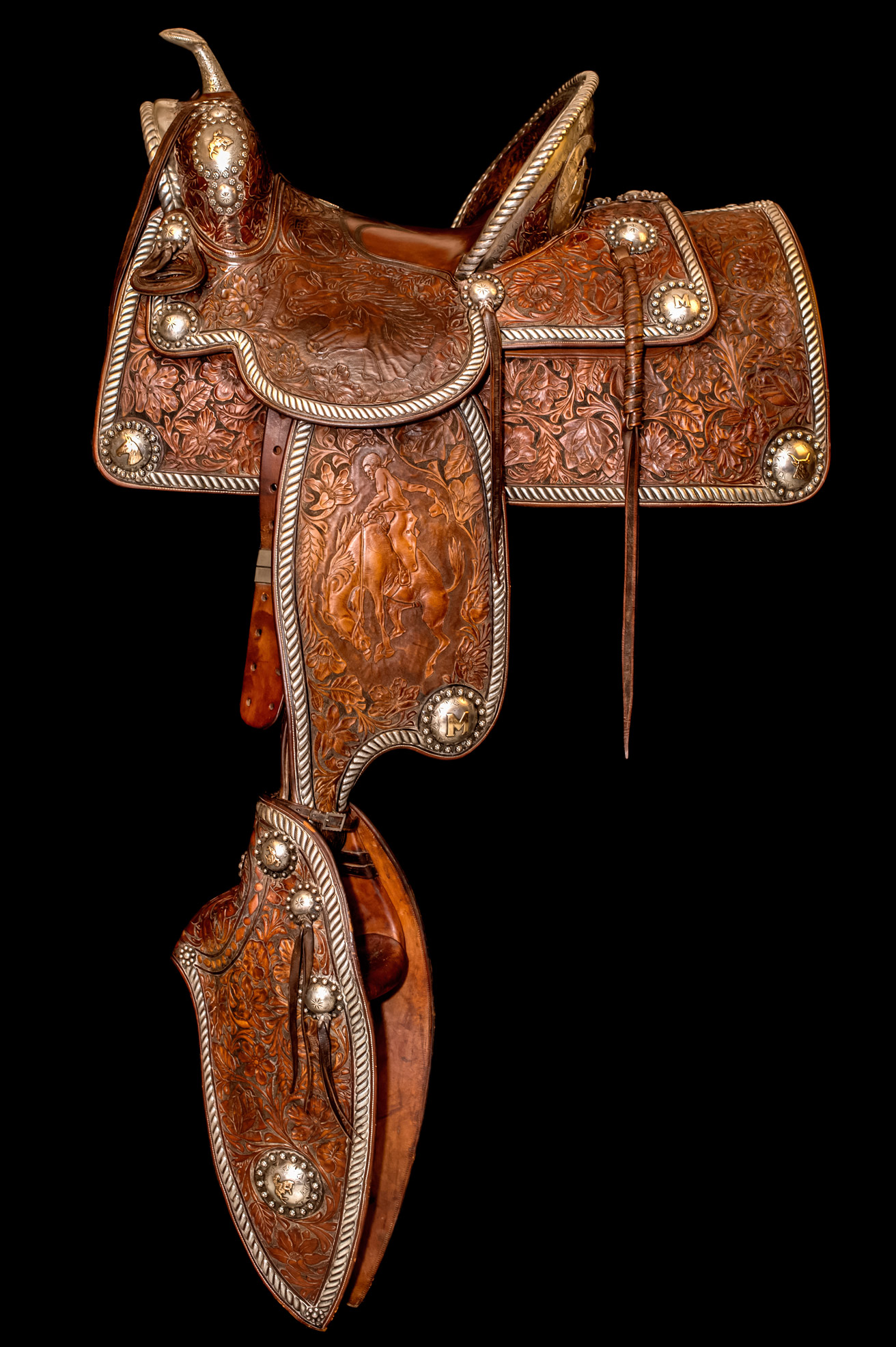 Cleverly crafted around an electric campfire, the show’s central pavilion displays the names and work of several of the most important saddlers in the region. The first saddle that comes into view as you approach is perhaps the most spectacular — a “Charro” style in black leather loaded with 1,500 silver buttons. This Visalia saddle was a gift from Will Rogers to Silsby Spalding, the oil and sporting-goods magnate who created Goleta’s vast Rancho Tecolote.