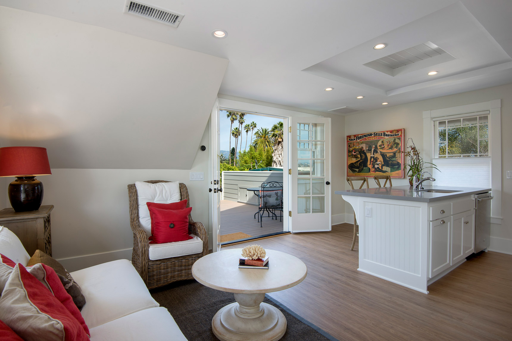 The upstairs is a completely separate, rentable, one-bedroom, one-bath unit. A staircase leads up from the back of the first floor to the deck, offering views of the Riviera and the mountains; plus, you can see the church as well as hear its chiming bells. This spacious deck is one of the most magical parts of the property, and it didn’t exist at all before the renovation. The inside of the upstairs unit is also charming. The kitchen and living areas are combined in one big room, with French doors leading onto the deck. The bedroom has beautiful Courthouse views, and even the bathroom offers an enchanting floor-level original window in a great use of space.
