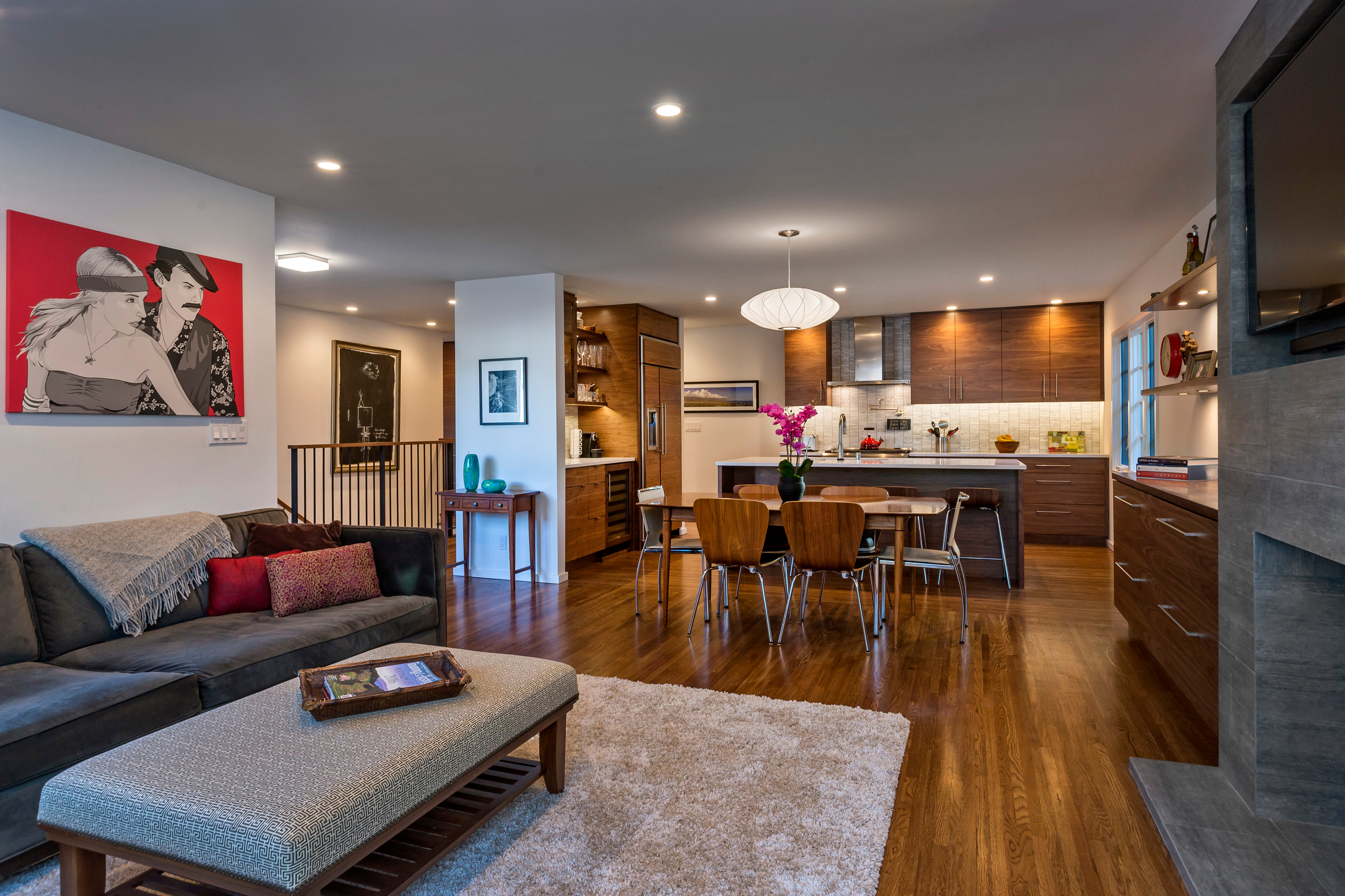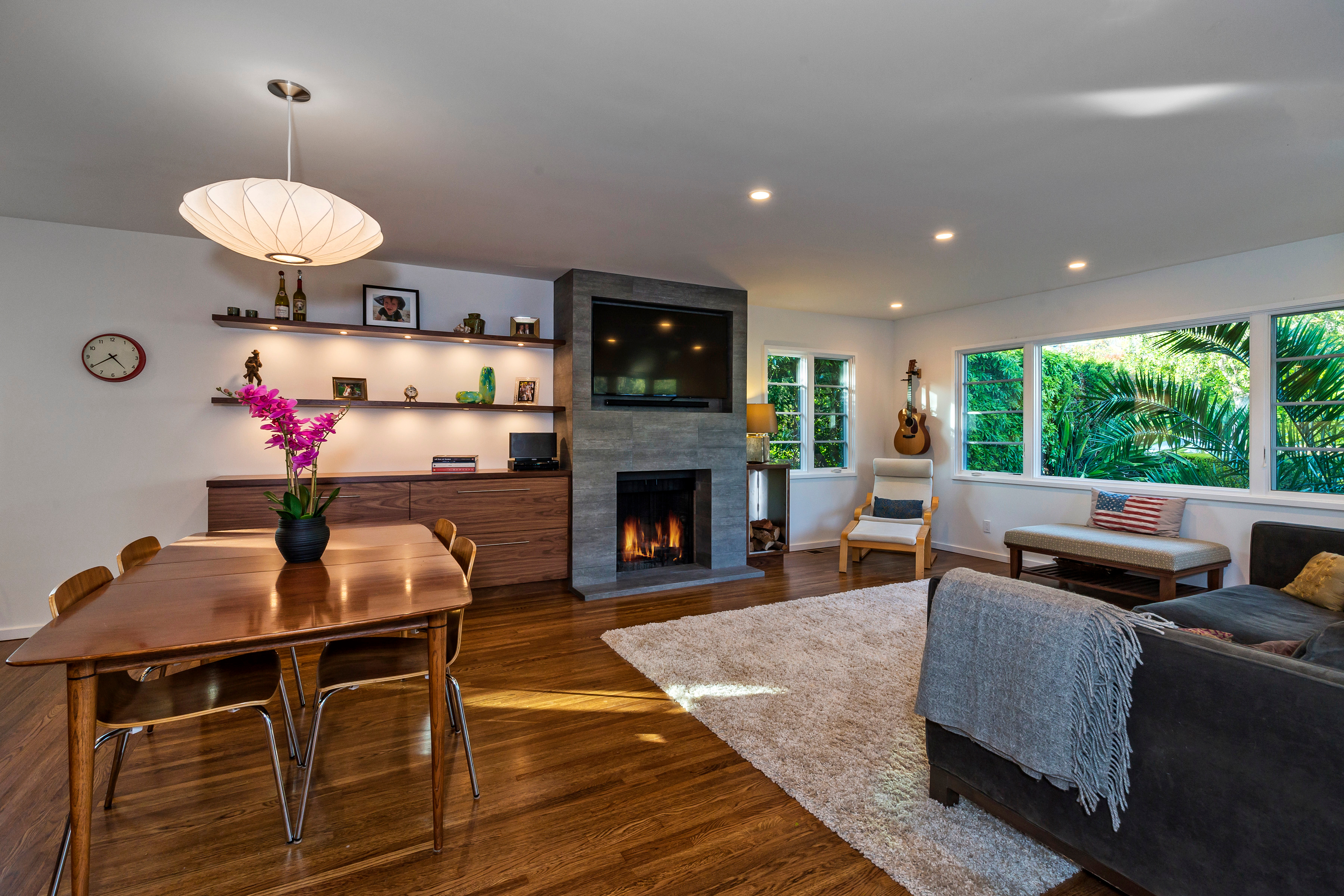 The far wall holds a massive floor-to-ceiling gray slate fireplace with a large TV inset at the top. Along the same wall, sleek shelves and cabinets grace the rest of the space. The house oozes a practical elegance with mid-century modern feeling and lines.