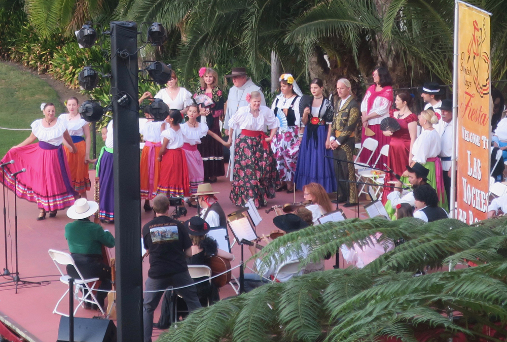 There was an extensive Mexican buffet open throughout the evening and live guitar music in the Mural Room. From the high perch of the Loggia, guests enjoyed the extensive song and dance performances in the Sunken Gardens below. Original 19th century Spanish California dances and songs were performed during Flor y Canto. The main show, Noches de Ronda, featured spectacular flamenco and Mexican folklorico dance performances.