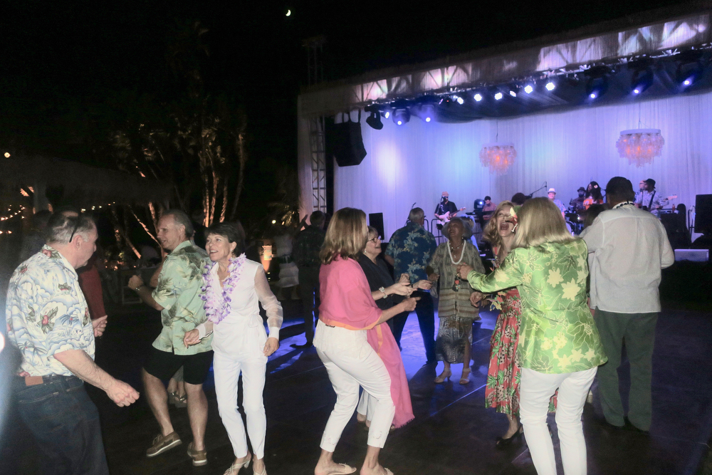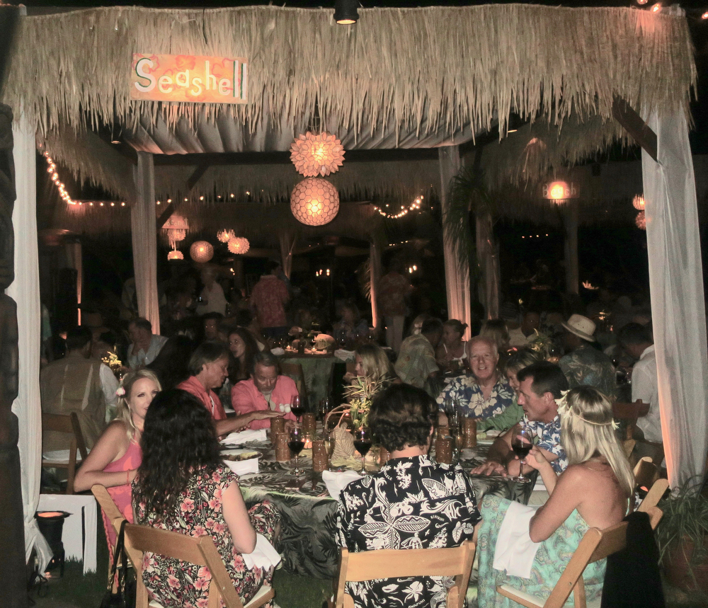 During the extended cocktail hour on the zoo’s expansive hilltop lawns surrounded by lush botanical gardens, guests clad in island wear partook of exotic cocktails and copious hot and cold hors d’oeuvres while the Replicas played soothing island tunes. Zoo Catering by Rincon prepared a succulent Polynesian-inspired buffet dinner, including macadamia-crusted yellowtail and coconut shrimp. Guests dined at round tables clustered under idyllic tiki huts with palm thatching. Repurposed seashells provided romantic lighting and space heaters mimicked tropical evening weather.