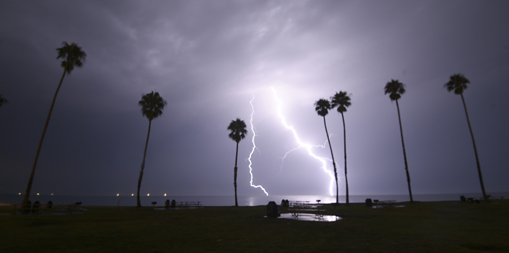 The storm, surprisingly quiet onshore, demonstrated varieties of lightning rarely seen in Santa Barbara, including some spectacular positive discharges to the ground, sheet lightning within clouds up and down the coast as the storm slowly moved onshore, and lightning bolts that crawled horizontally under the clouds.