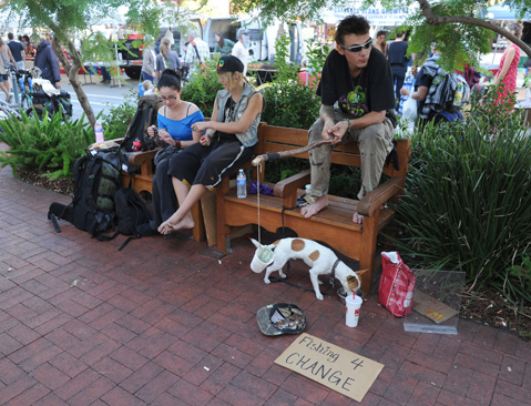 As a card-carrying downtown worker bee, I have had the impression that the misbehavior of a few undeniably obnoxious street people has been strategically exaggerated to distract us from the bigger problems: exorbitant rents, rapacious landlords, and retailers who insist on selling stuff no one wants. But maybe I’m missing something. As a card-carrying Investigative Reporter, I began a fact-finding tour, starting at State and Figueroa streets, where two of the four corners were occupied by bona fide panhandlers and one by a young guy dressed in black aggressively hawking antioxidant-infused cosmetics to all female passersby, whether they were interested or not. One of the panhandlers sat quietly perched on a stone wall by Andersen’s Danish Bakery with a small dog and a cardboard sign reading, “Hungry for Two.” She wore a hat inscribed with “Jesus Is Boss.” Unless you were looking, you could easily have missed her. I gave her 50 cents. We chatted. She lives in a van with her husband, whom she met at the homeless shelter about 13 years ago and where she won’t go anymore. Lice. I did not feel intimidated. Across the street, I noticed female pedestrians veering into State Street to avoid the lunging advances of the man in black, who was trying to foist upon them samples of his wares. On another corner was a middle-aged woman sitting sad and holding a cardboard sign reading, “Anything helps.” No one veered.