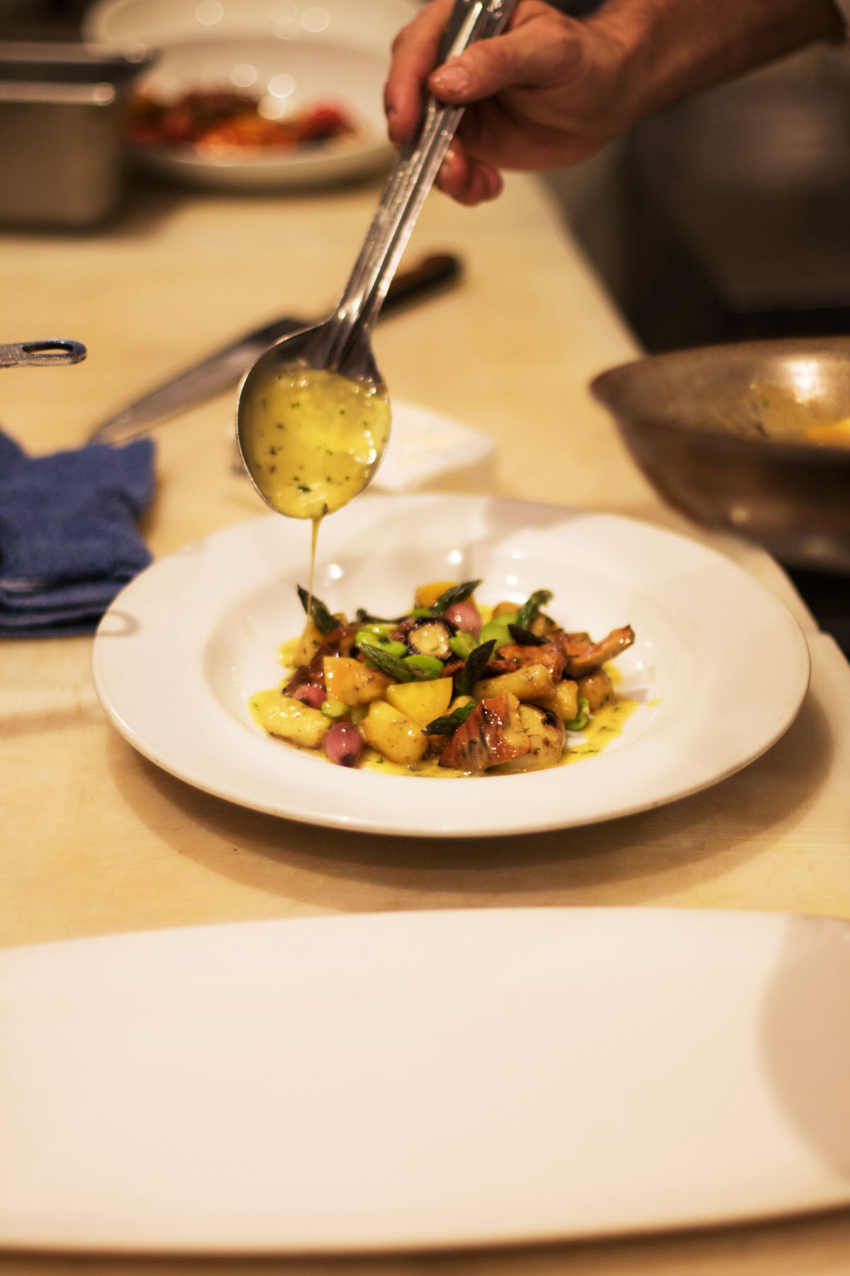 When I arrive, he’s surveying his kitchen, looking for inspiration among the crates of produce. It’s this off-the-cuff approach that makes his vegetarian dinner course such a hit with guests — it’s individually tailored around each diner’s preferences and never the same from week to week. When he sets down a plate of delicately pan-seared gnocchi pillows moments later, I can see why. Tossed with hearty fava beans and golden beets coated in a decadent mushroom and red wine deglaze sauce, it is the culinary personification of autumn. “Inevitably, someone always cranes their neck over to see one of these dishes being served, and suddenly we’ve got four more orders that night,” laughs Sjerven, and neither one of them seems bothered by the prospect.