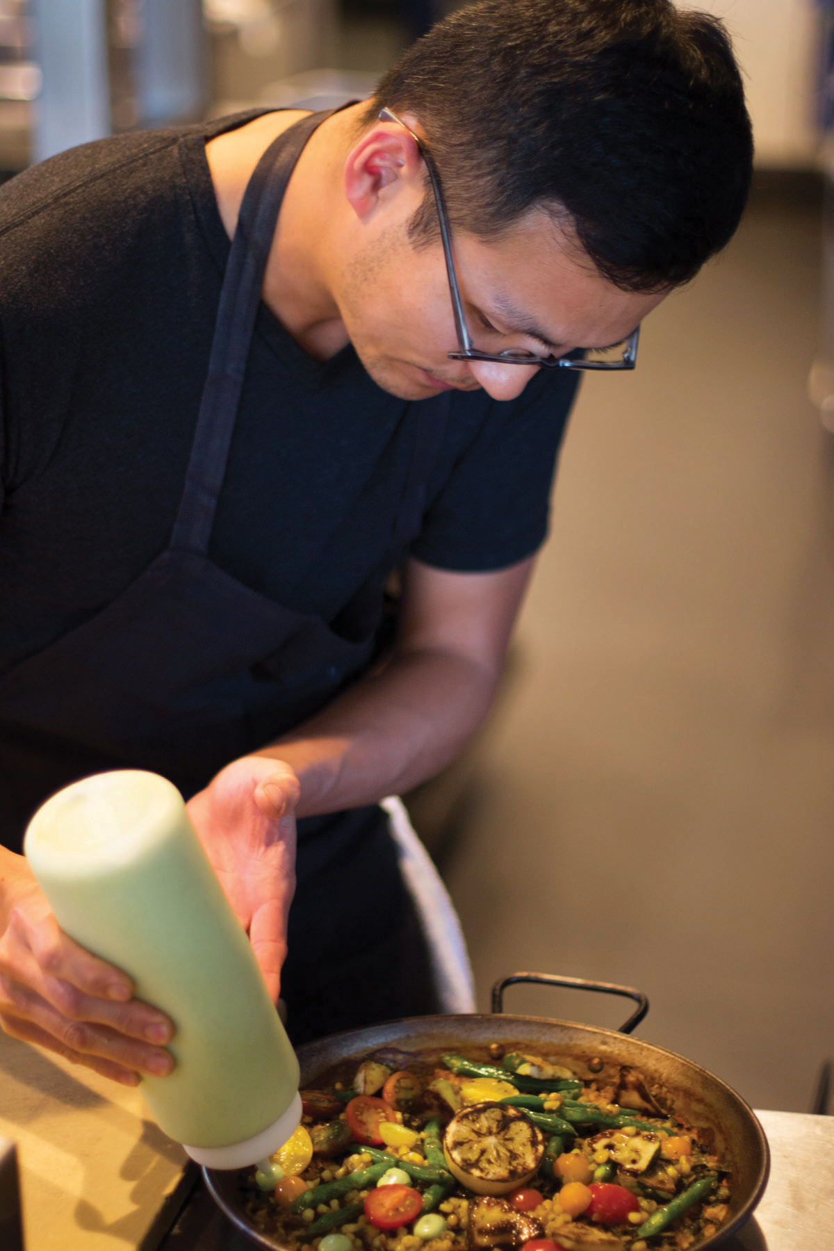 I’m here to try their buzzed-about vegetable paella, made with a four-hour sofrito recipe and loaded with seasonal veggies that include sunburst squash, heirloom tomatoes, roasted corn, and Blue Lake green beans. As Lee hands me the customary spatula used to scrape the paella into the center of the pan, I catch a glimpse of him leaning over to study the rice’s underside — the most critical component of a well-executed paella. “Not bad,” he mumbles to himself — and the twinkle in his eyes is unmistakable.