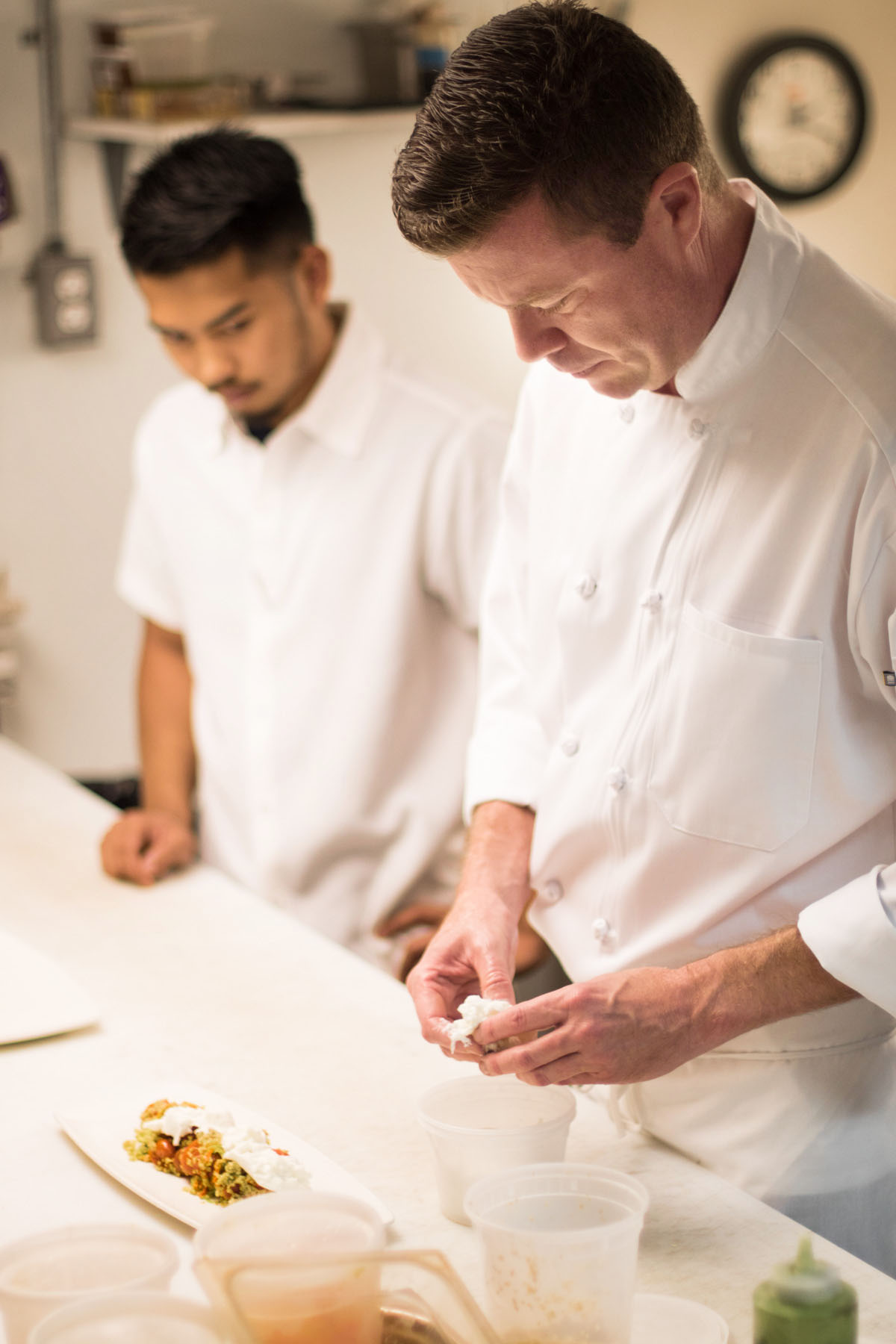 Chef Riker furrows his brow and hands me a warm bowl of pasta. “I’m really trying to dial in the consistency of the cheese,” he says thoughtfully. By “cheese,” he means a creamy cashew and carrot puree with a dash of turmeric that’s remarkably symbiotic in flavor and texture. His other dishes have a similar effect: a chopped salad turned on its head with the addition of cauliflower and dates and held firmly into place with a bright, ginger dressing; and an earthy wild mushroom tostada, its texture soft and hearty against a crunchy curtido slaw.
