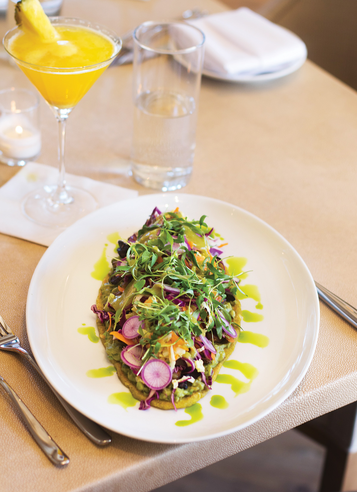 Two weeks in, and Riker’s meat-, dairy-, and egg-free menu is appeasing both vegans and omnivores alike, offering up a fresh take on farm-to-table dining with inventive riffs on wine-country classics. “As a meat eater, I thought this would be a good opportunity to push my knowledge of veggies, and now I find myself eating this way 90 percent of the time,” admits Riker. Though Riker is not interested in schooling anyone about the benefits of a plant-focused diet, his infectious energy and creative approach is already making headway among the skeptics. “The response has been mind-blowing, and seeing a steady stream of repeat customers is really encouraging.”