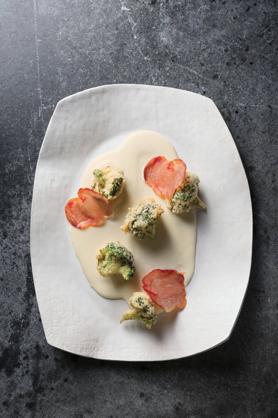 Nods to kiddie stuff abound: Chickpea-battered broccoli with lomo and mornay is introduced via homage to cheddar-broccoli soup; Kish compares her béchamel to Velveeta. She summoned deviled ham and pimento cheese’s “delightful tackiness” to arrive at the ham-and-comté appetizer she first made at one of Questlove’s food salons. The kataifi-wrapped burrata with date syrup and radish? Nothing more than a gussied-up mozzarella stick! (Lest the down-hominess taste contrived, consider: Asked what she most craves after a long night in the kitchen, she replied, “Chicken fingers, grilled cheese cooked by someone else, High Life beer.”)