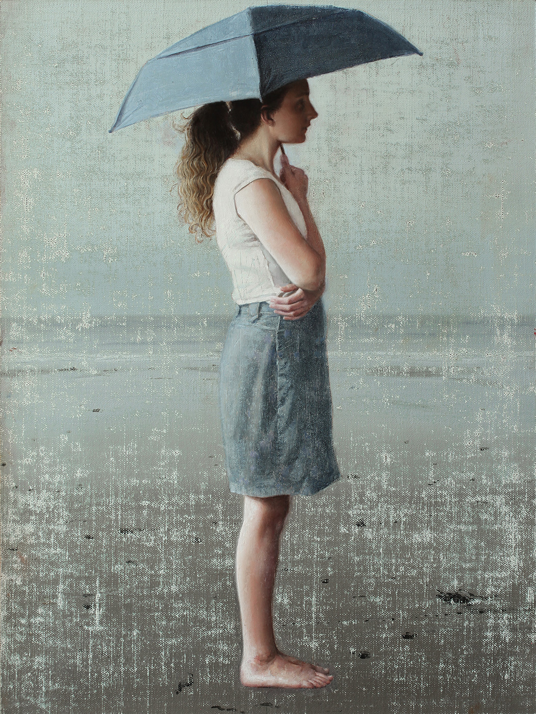 In Nava’s work, the technical means of production is always in critical dialogue with the subject matter and the execution. The artist built this wide horizontal panorama out of dozens of figure studies, several of which are on view in the show at Sullivan Goss. Echoing the decidedly un-aristocratic, subtly utopian feeling of Seurat’s Sunday in a public park, Nava finds the beauty and humanity in a collection of beachgoers who, while not motley, are nevertheless conspicuous only in their relative disregard for the conventions of covering up and remaining fully dressed that typically apply in public places. Bathing suits, wetsuits, T-shirts, and shorts — they are all here, and the people wearing them all receive equally reverential treatment from the painter. Stepping definitively away from the hierarchical representational schema of history painting and official portraiture, Nava, like his master Seurat, elevates the leisure of the middle class to the status of a masterpiece.