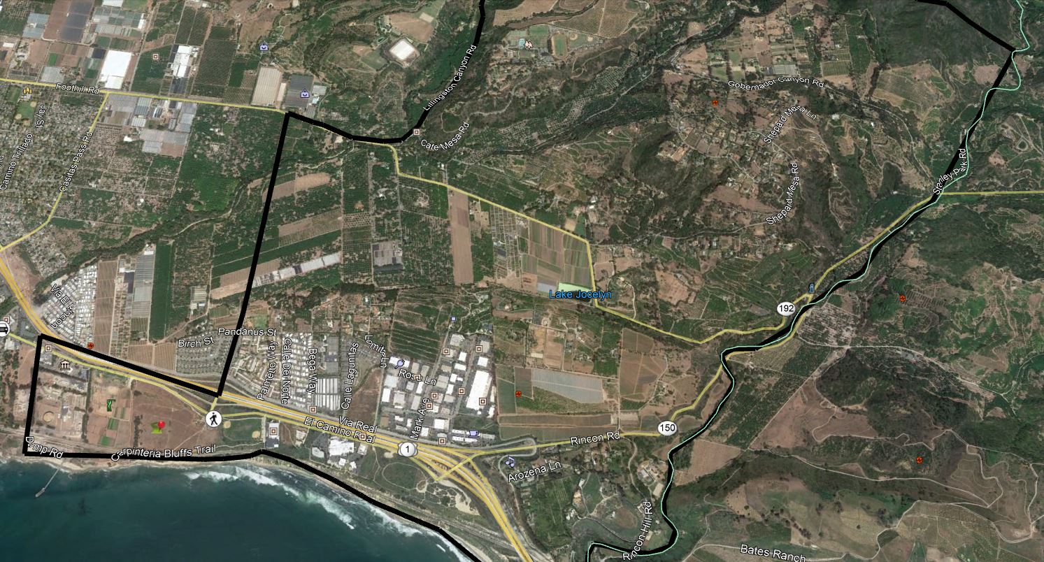 - All areas from the 5500 block of Casitas Pass Road (Hwy 192) east to the county line to include Lillingston Canyon and Cate Mesa, and all addresses north to the county line.