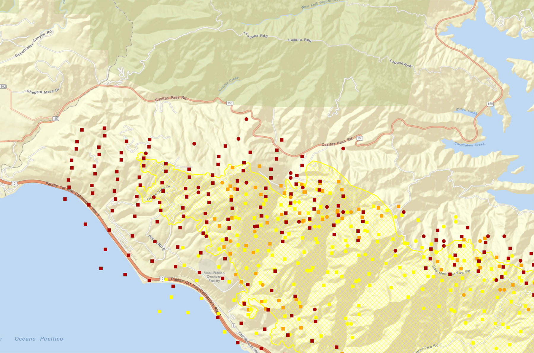 While winds weren’t blowing as intensely on Wednesday, Quirarte indicated that major growth has taken place on the western and northern sides of the fire, both above Ojai and off Highway 33, in the broad swath of coastal range between Foster Park near Lake Casitas and La Conchita. There’s no word yet on the hundreds of oil-drilling pads that pockmark the coastal foothills above that area.