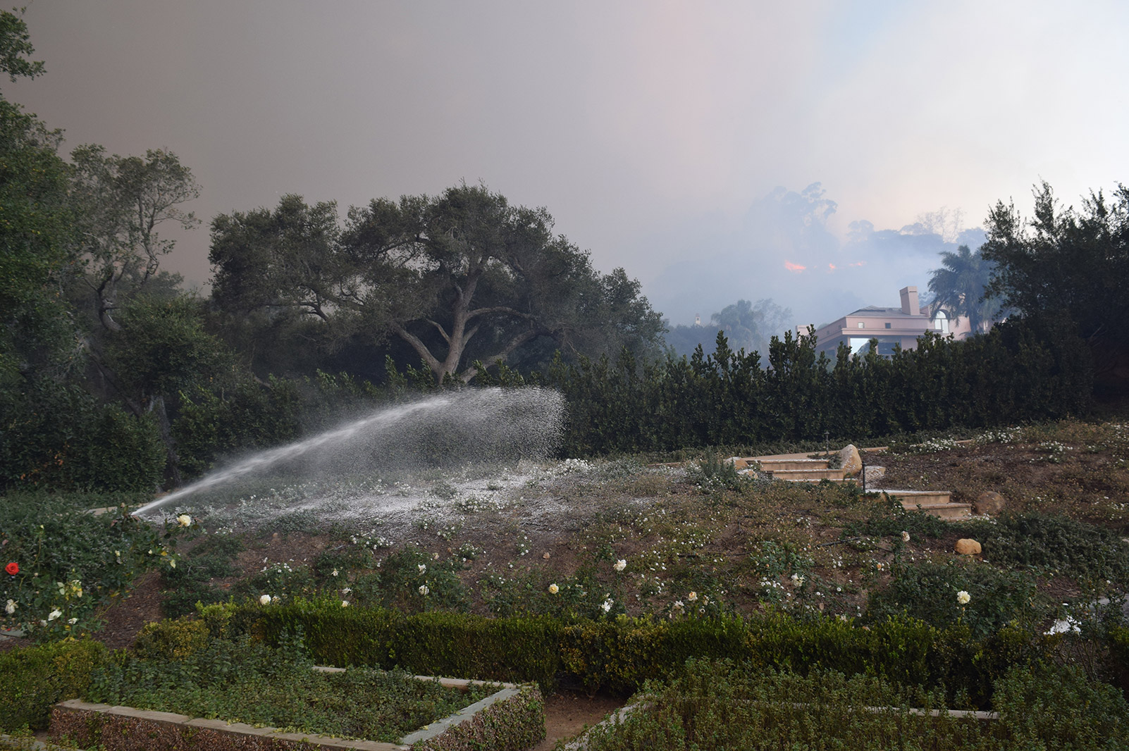 One Toro Canyon homeowner, Cheryl Giefer, heard about Chubb’s fire-protection services from her neighbors. When the fire first crossed the Santa Barbara County line, her husband called their insurance provider, Allstate, to see if they offered similar services. Shortly after they were evacuated, she received text messages and iPhone photos from private firefighters who showed up to her property. “House is okay now but the fire is at the back on the hill coming down,” the message read.
