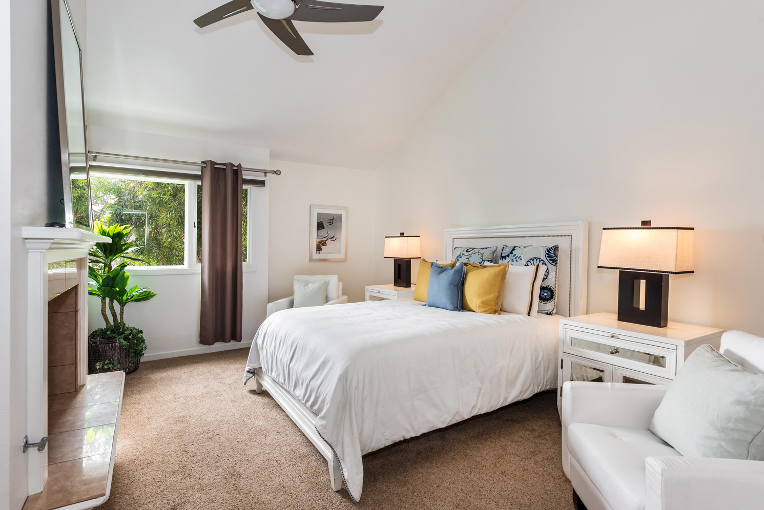 The townhome at 901 Weldon Road is a spacious two-bedroom, two-and-a-half-bath home with a tri-level floor plan. The kitchen, living, and dining rooms are on the main floor and open to each other, yet with an obvious flow and definition of living areas. From the front door, the living room is down two steps and boasts a sleek, tiled fireplace as its focal point. It feels cozy and spacious at the same time, thanks to its cathedral ceilings and sliding glass doors that open onto the back deck.