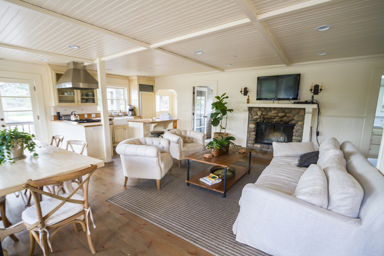 Beyond the barn and on the other side of the pool sits a two-bedroom farmhouse and a separate one-bedroom casita. These residences have been completely restored and updated, while still retaining their original charm. They have period details like beadboard wainscoting and arched doorways. The farmhouse has a gorgeous kitchen with glass-fronted cabinets, high-end appliances, an adorable built-in dining nook, and appropriately enough, a farmhouse sink. It’s all new, but still in keeping with its circa-1880 pedigree.