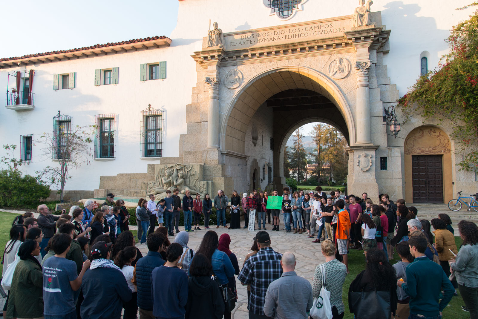 A tight circle of 120 people stood in front of the courthouse May 17 at 7 p.m. The clock tower rang as candles were positioned in the center of the circle. The people were gathered for a vigil, organized by UCSB Students for Justice in Palestine, PODER Santa Barbara, and the community of Santa Barbara, honoring the Palestinian victims murdered on May 14 by the state of Israel.