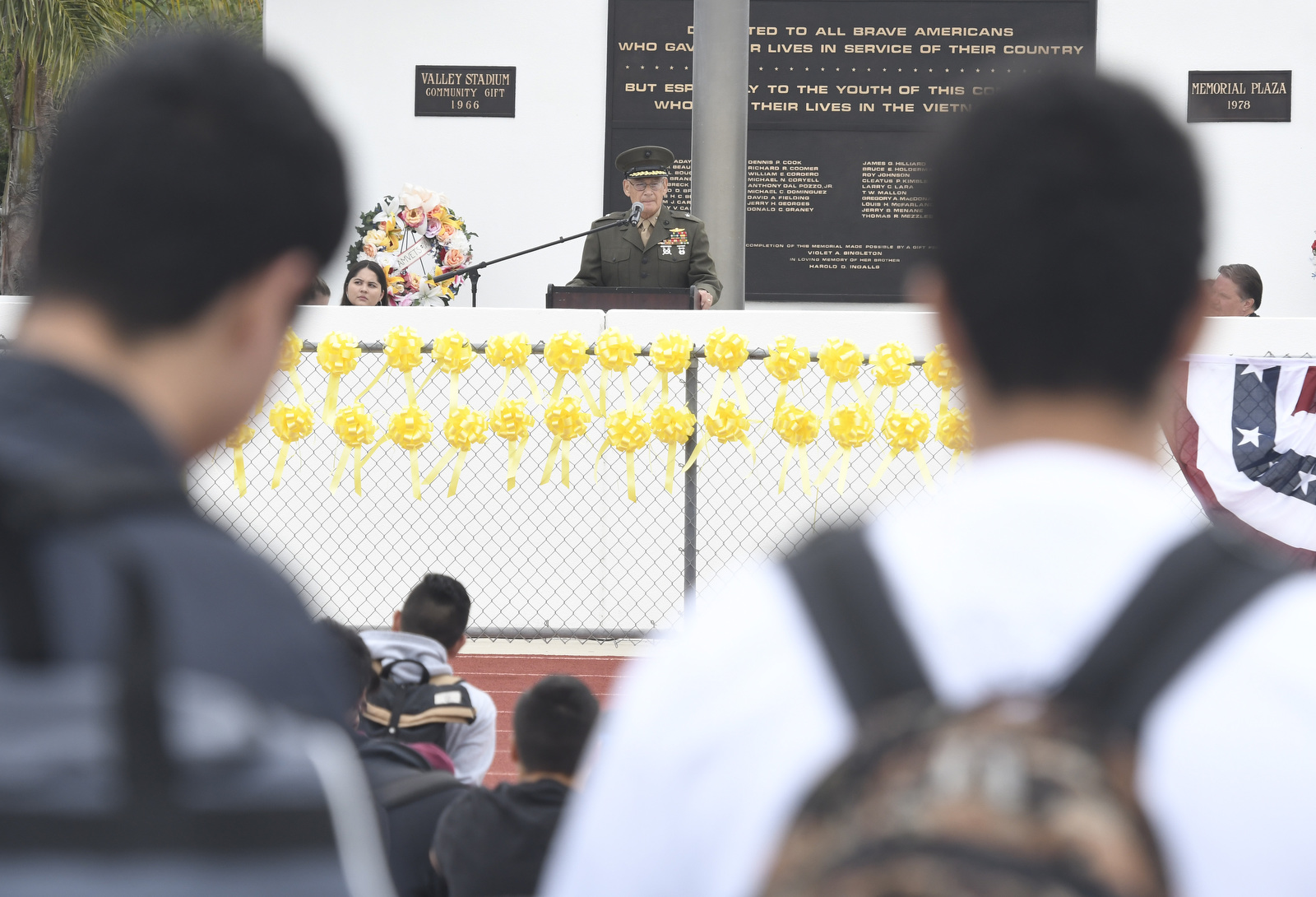 U.S. Marine Corps Brigadier General Frederick Lopez was the keynote speaker at the Memorial Day event at San Marcos High School on Tuesday. Lopez played football for Lompoc High and attended Cal Poly in San Luis Obispo before serving in Vietnam. At the high school gathering, Lopez drew attention to the 38 names etched in the high school’s Vietnam Memorial Plaza in Warkentin Stadium — names of former students of San Marcos, Santa Barbara, and Bishop Diego high schools and Santa Barbara City College who lost their lives in the Vietnam War.