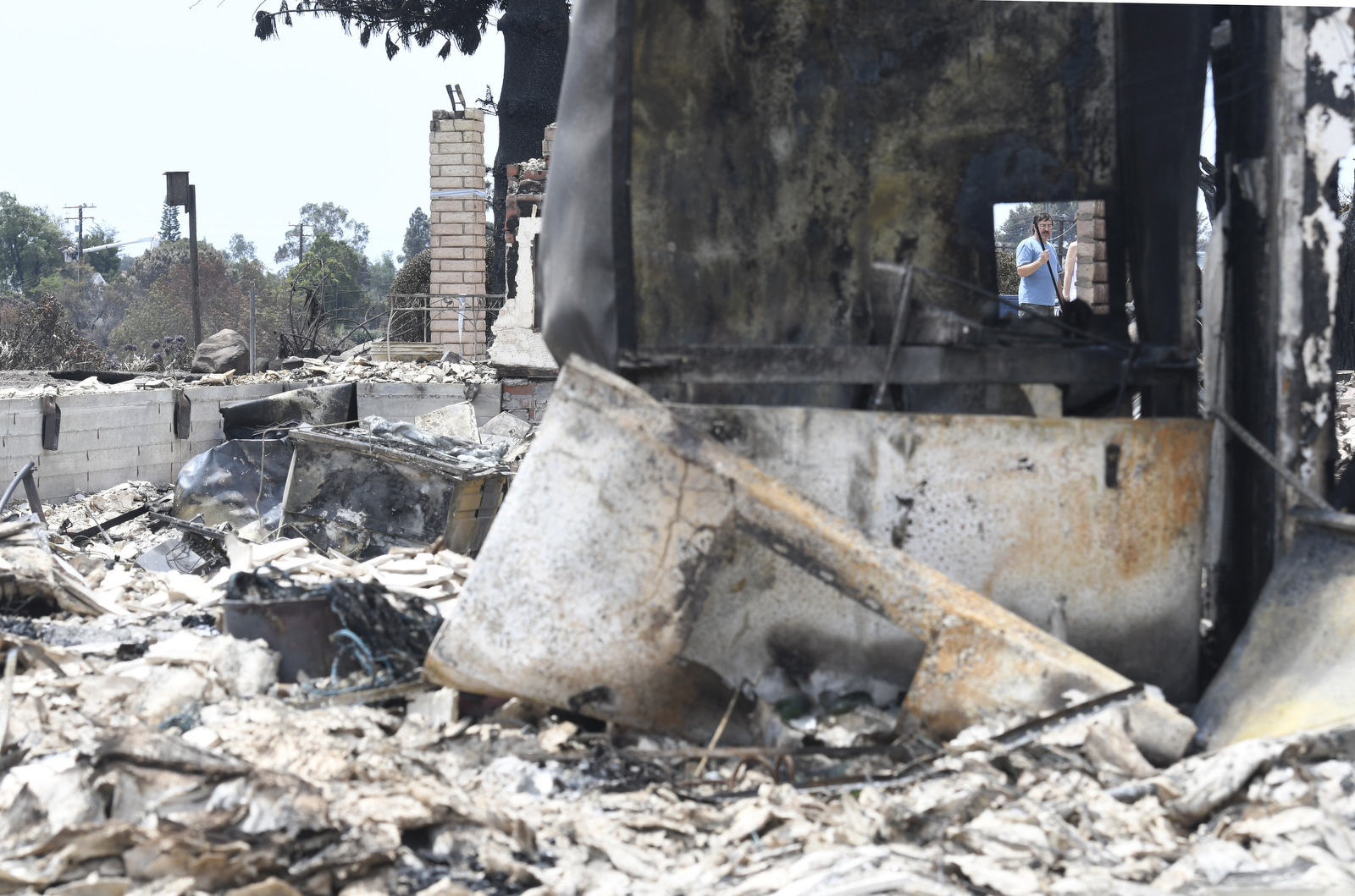 The vagaries of brushfire were no more evident than at these two homes: Only the chimneys remained of the Thoman house, despite a broad expanse of mown yard and a wide concrete apron in front of the home. The house is on a piece of land that juts into the blackened eastside of the valley behind it. “All our baby pictures,” said Thoman tearfully, “their drawings from school and their handprints. We didn’t have a chance to save anything.”