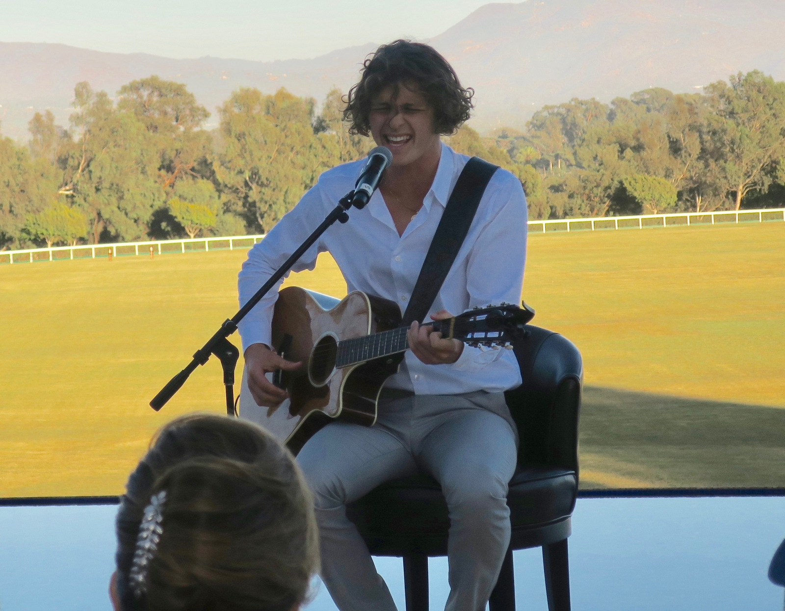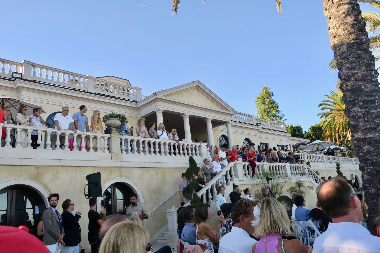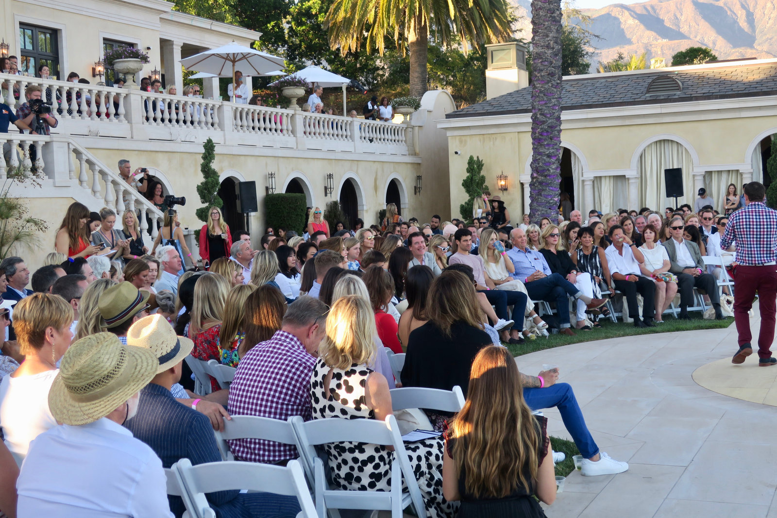 During the reception, guests mingled on the grand, lavish terraces of the main house overlooking the polo field, mountains, and ocean. Dancers from Airedanse Collective dazzled the crowd. Fashions from the show were on display for purchase on one terrace, gourmet food, beverages, and silent auction items were on another.
