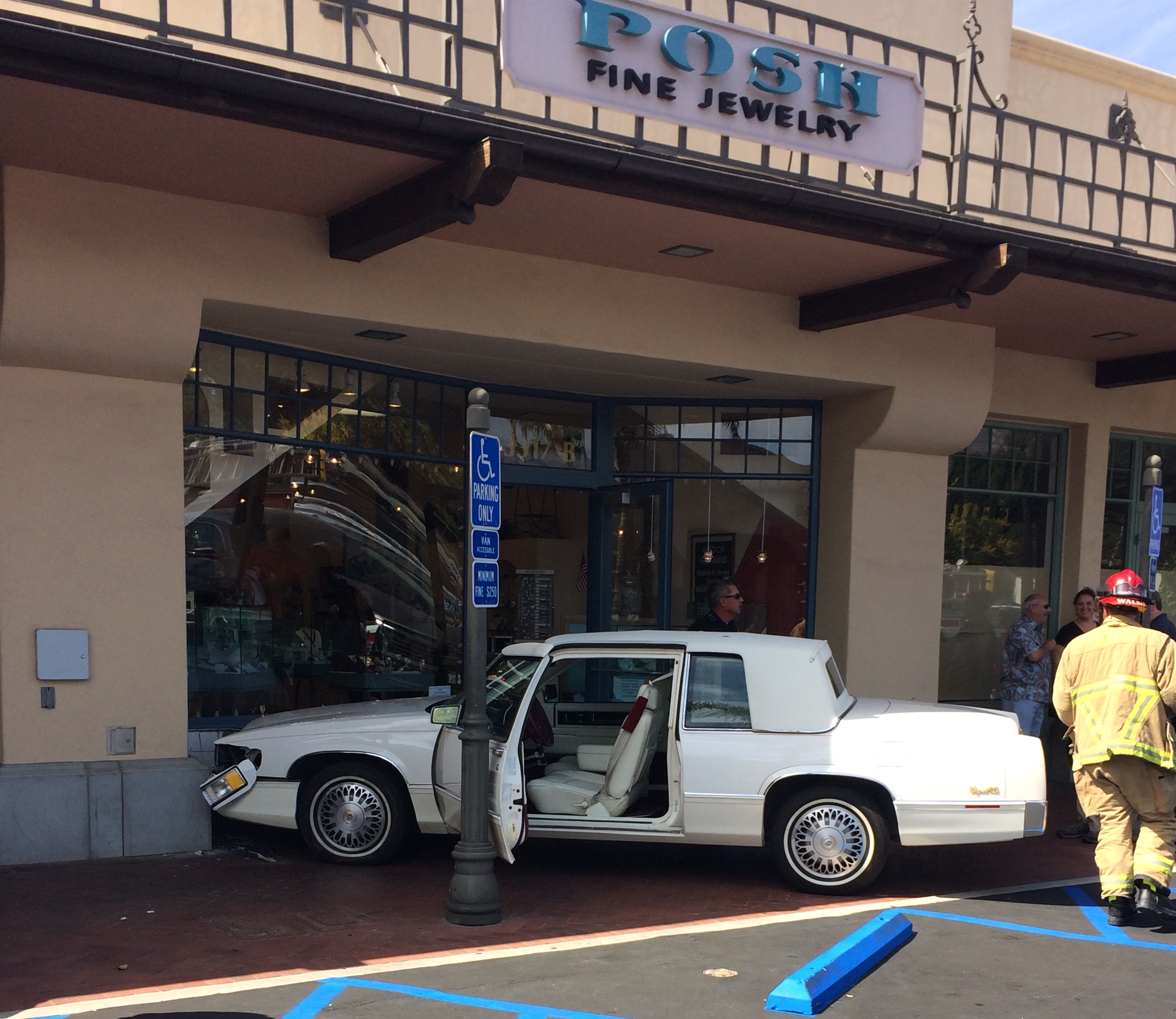 Minor damage occurred to Posh jewelers when an elderly driver drove over the concrete parking spot bumper and ran into the building wall at Loreto Plaza on Wednesday afternoon. A firefighter happened to be having lunch on the patio 10 feet away, reported the City Fire Department, and ran to the driver and passenger in the white two-door sedan to assess their condition. Both were fine, as were the many pedestrians in the shopping center, which includes Chaucer’s Books, Harry’s Plaza Cafe, and Gelson’s Market.
