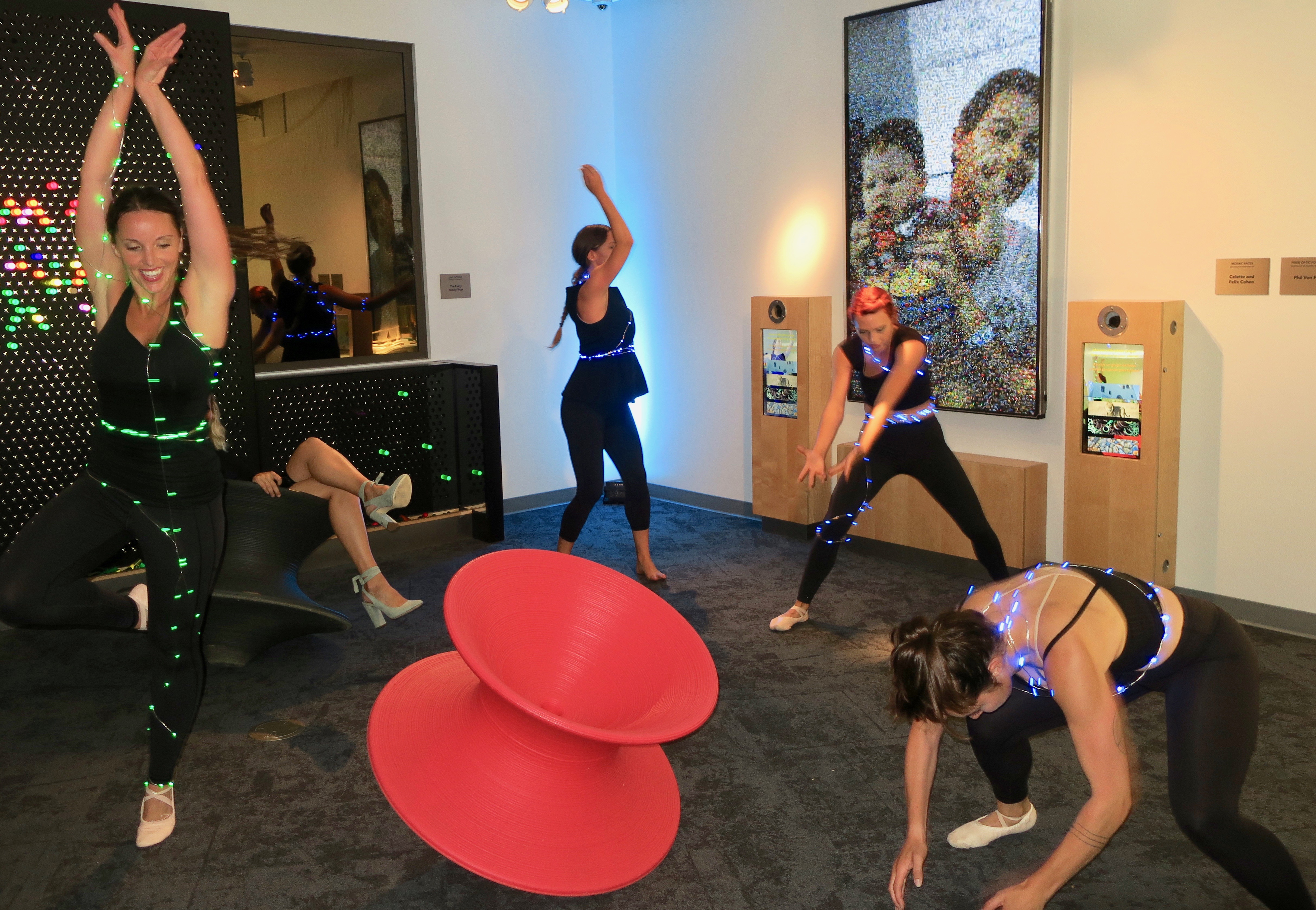 Breathtaking cyr wheel performances were offered in the rooftop Sky Garden by EMCirque, while Selah Dance Collective dancers festooned with colorful LED lights did fun, roving pop-up performances inside the museum. Other diversions included a liquid light show and a race car raffle in which guests were encouraged to build and race their own cars. There was a preview of the newest exhibit Zoomorph and a specially-created Infinity Balloon Room, with waist-high colorful balloons for guests to romp around in, which guests enjoyed with drinks in one hand, iPhone cameras in the other.