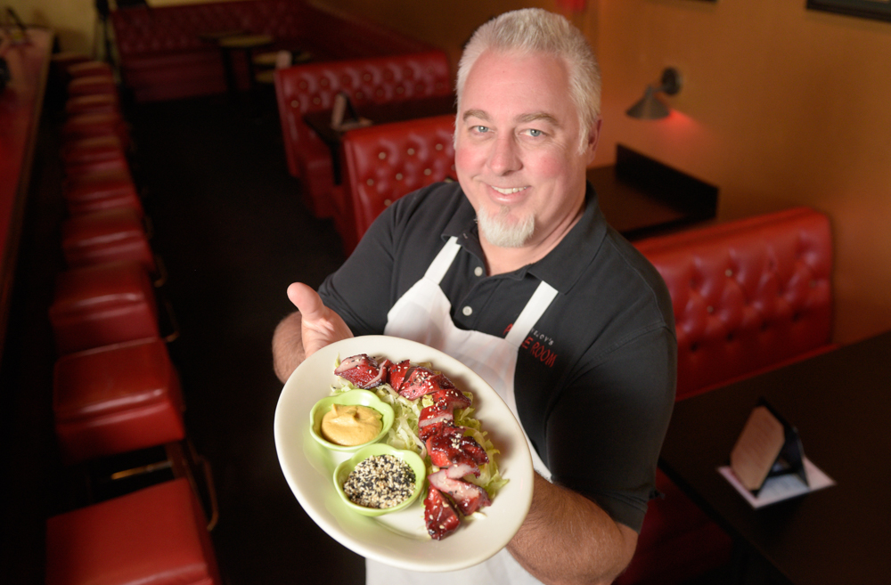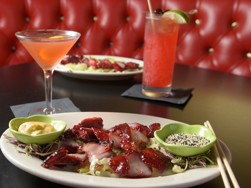 Without divulging the specifics, Lovejoy said that the marinade includes hoisin, garlic, ginger, and red food coloring, and that he throws a smoke box in the oven to give it the barbecue kick. He uses the pork cushion (part of the shoulder) for the meat, cuts it on the bias, and serves it with “the Chinese mustard and the sesame seeds to dip it in, and a little bit of cabbage on the plate — some roughage for you.”