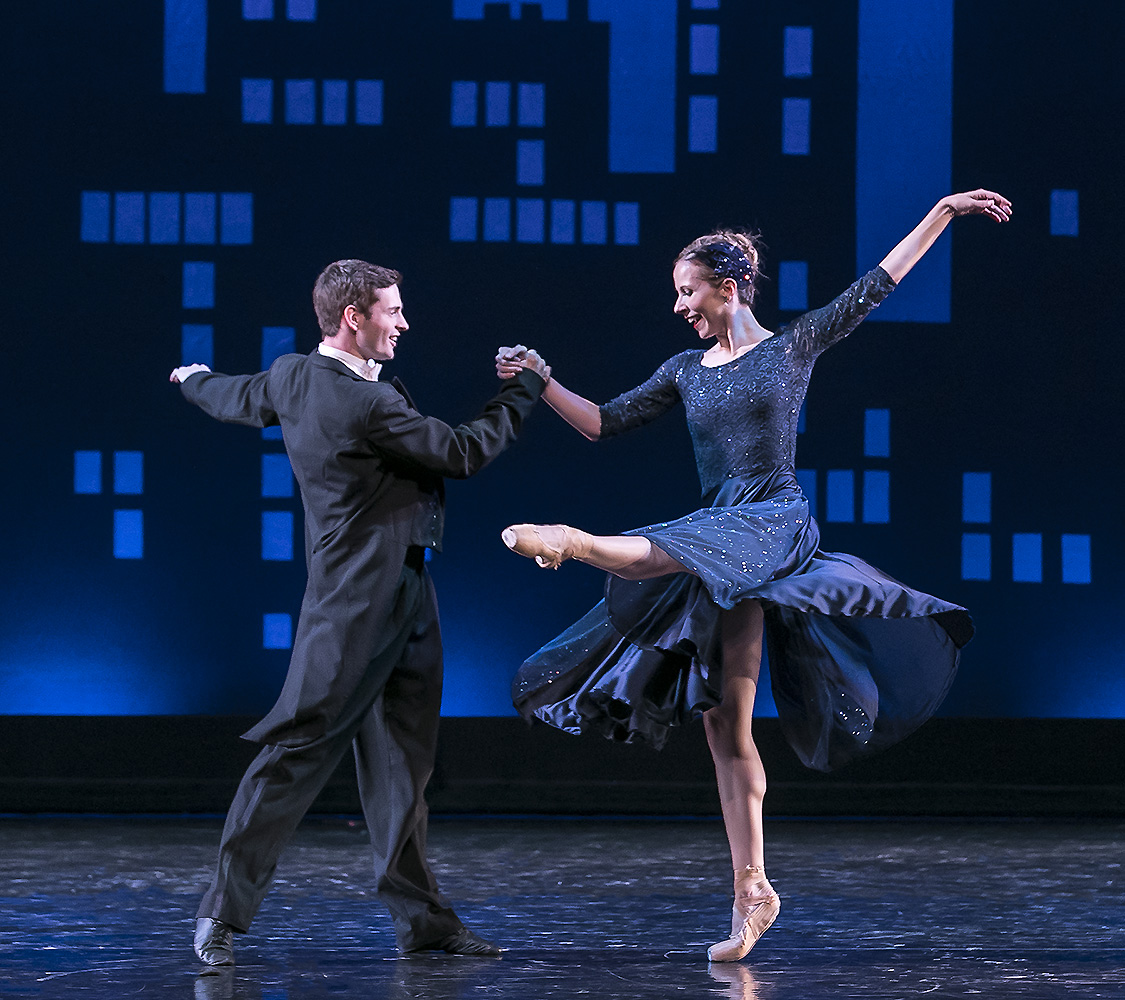 At this most eventful time of the performing arts year, when virtually every organization in town is mounting some kind of production, leave it to State Street Ballet (SSB) to present something that’s as bright, joyful, and full of happiness as Ballroom. Focusing on the pleasures of social dance through the lens of ballet, the seven pieces on the program each framed the subject in a different way. “Five by Gershwin” showed the choreography of SSB co-artistic director William Soleau at its most romantic and glamorous, with the men in tail coats and the women in brightly colored gowns. In “They Can’t Take That Away from Me,” a quartet that saw him pursuing three beautiful women first in turn and then all at once, longtime company member John Christopher Piel showed that he’s grown into the ballet equivalent of a Hollywood leading man from the golden age, capable of warmth, wit, and self-deprecating humor, sometimes within the short space of a few bars.