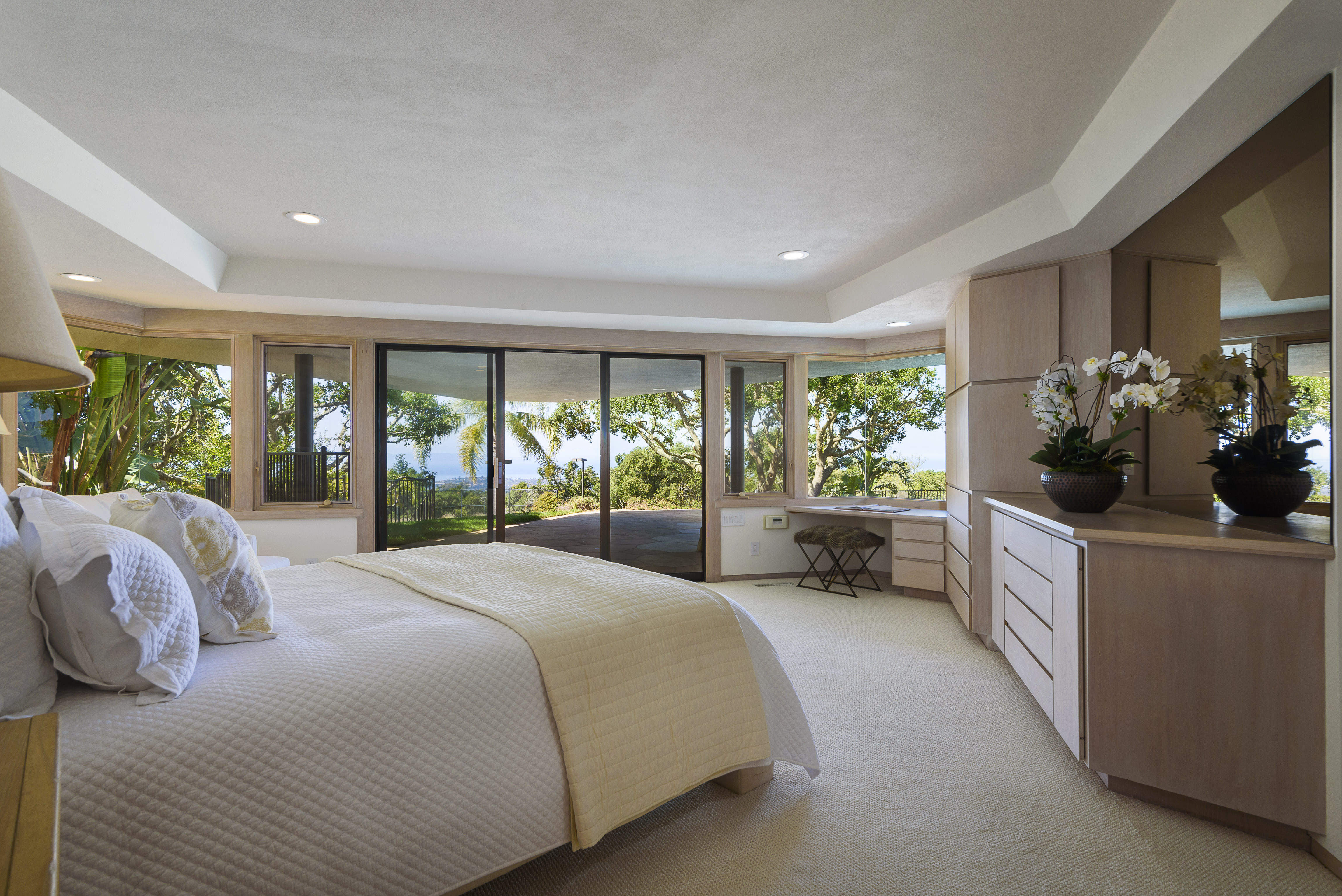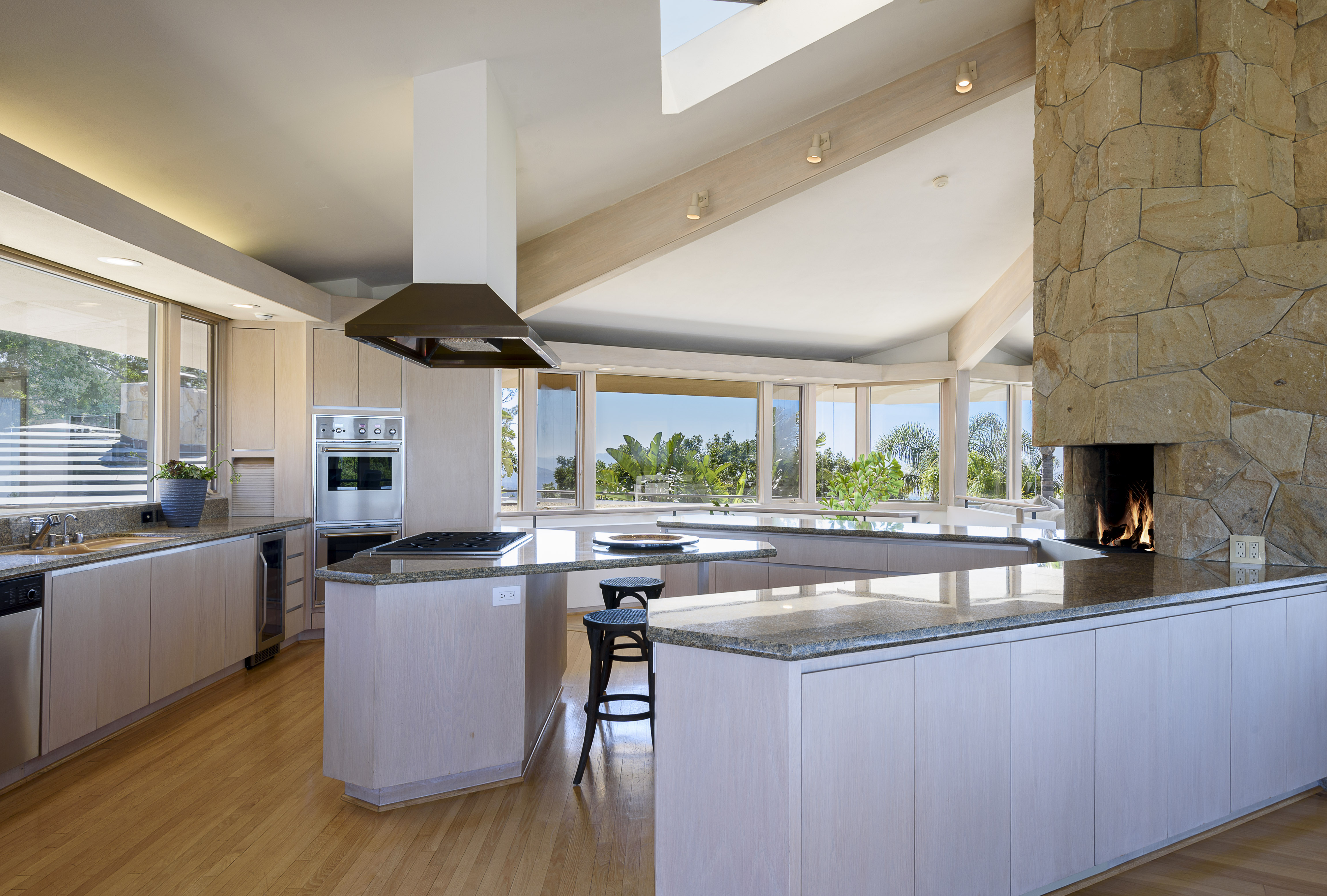 The upper floor is one huge great room, with a floor-to-ceiling Santa Barbara stone fireplace in the center. The room is separated into six sections with distinct kitchen, dining, and living areas defined by exposed wood beams in the vaulted ceilings and columns inset in the “corners” of the room. The center of attention, however, is undisputedly the 360-degree panoramic views, enjoyed through uninterrupted walls of glass.