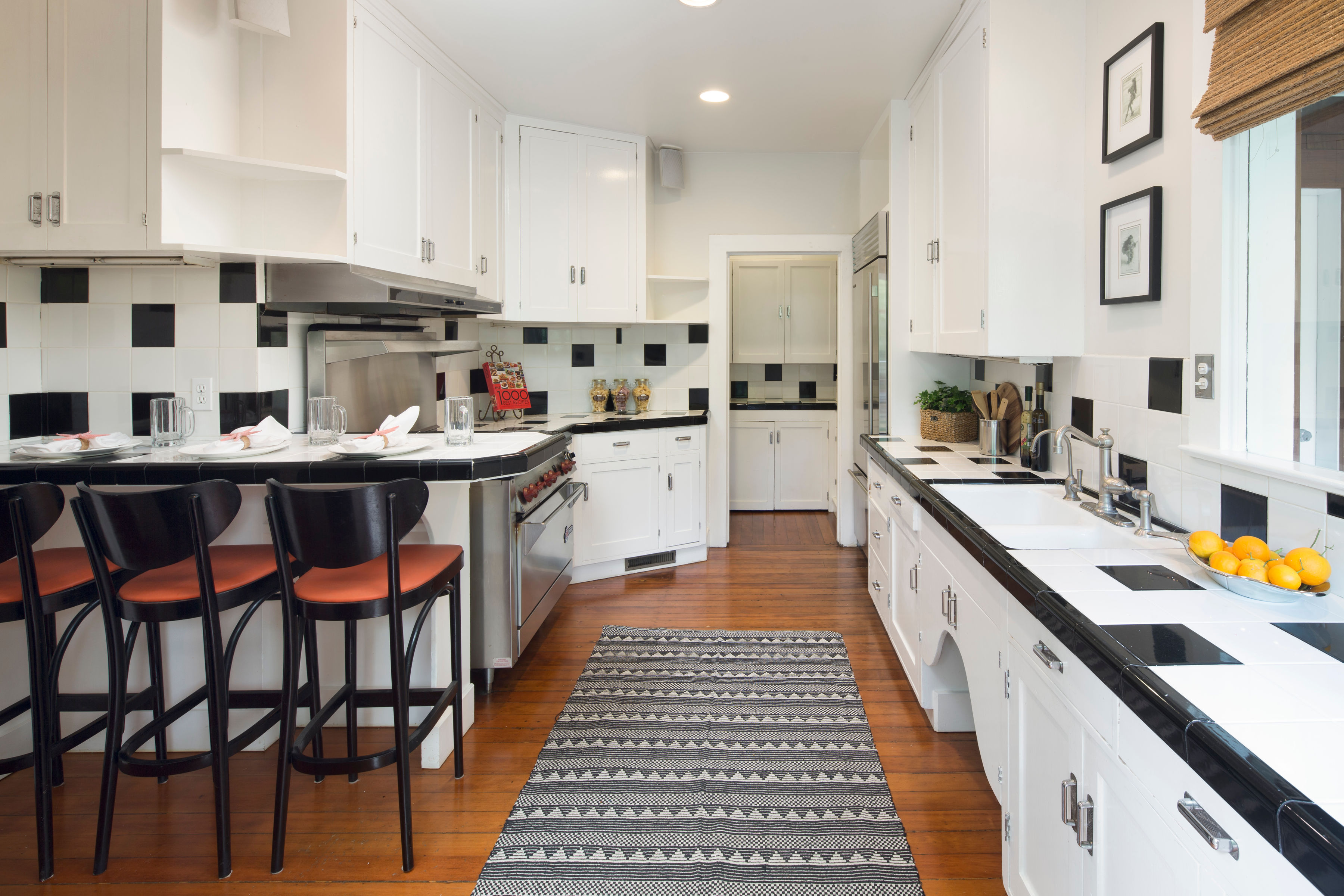 The kitchen is one of the magical parts of this home. Black-and-white tile counters and backsplash and white vintage cabinets cohabit with state-of-the-art gourmet appliances in a happy blend of turn-of-the-century style and modern convenience. This large L-shaped room includes a pantry and a back kitchen area that contains a second sink and the washer and dryer. Yet another back door opens onto a covered porch, which could be used as a secondary main entrance.