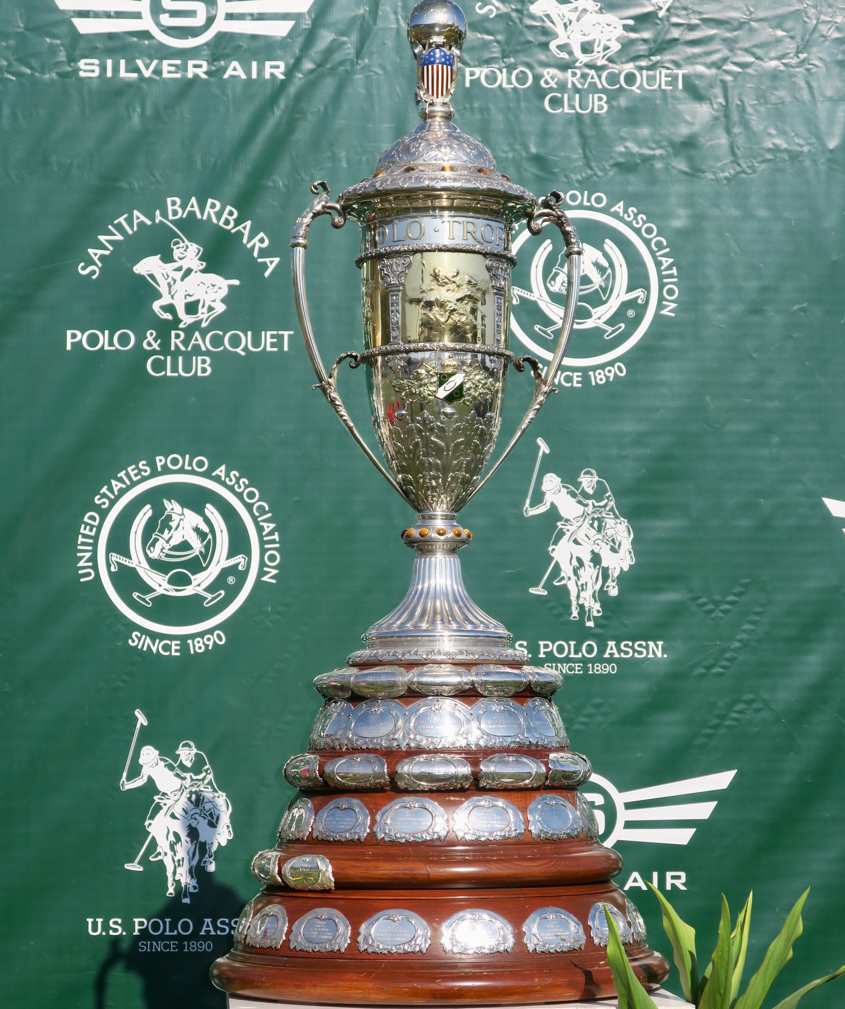 The Pacific Coast Open dates back to 1909 and has been held at the Santa Barbara Polo & Racquet Club since 1952. The stunning silver and gold trophy, on display on the clubhouse terrace, stands five feet high. Crowned with an eagle supporting a globe and adorned with semiprecious stones, the trophy is mounted on a redwood base with side panels depicting lively polo scenes.