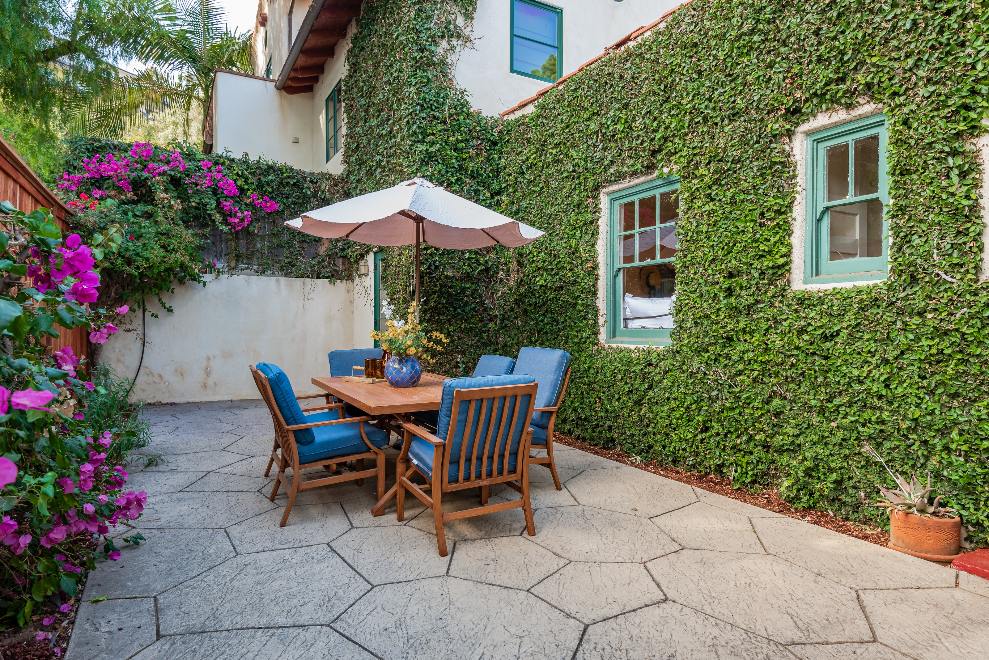 On the other side of the house, a doorway from the living room opens onto a private courtyard patio surrounded by a tall redwood fence and bordered by greenery, including a wall of ivy that curls picturesquely up the side of the house. This picture-perfect setting will be a go-to spot for almost-year-round dining and entertaining. Listening to the sounds of the Bowl shows next door while relaxing as the sun sets, summer in Santa Barbara will continue on, no matter what the calendar says.
