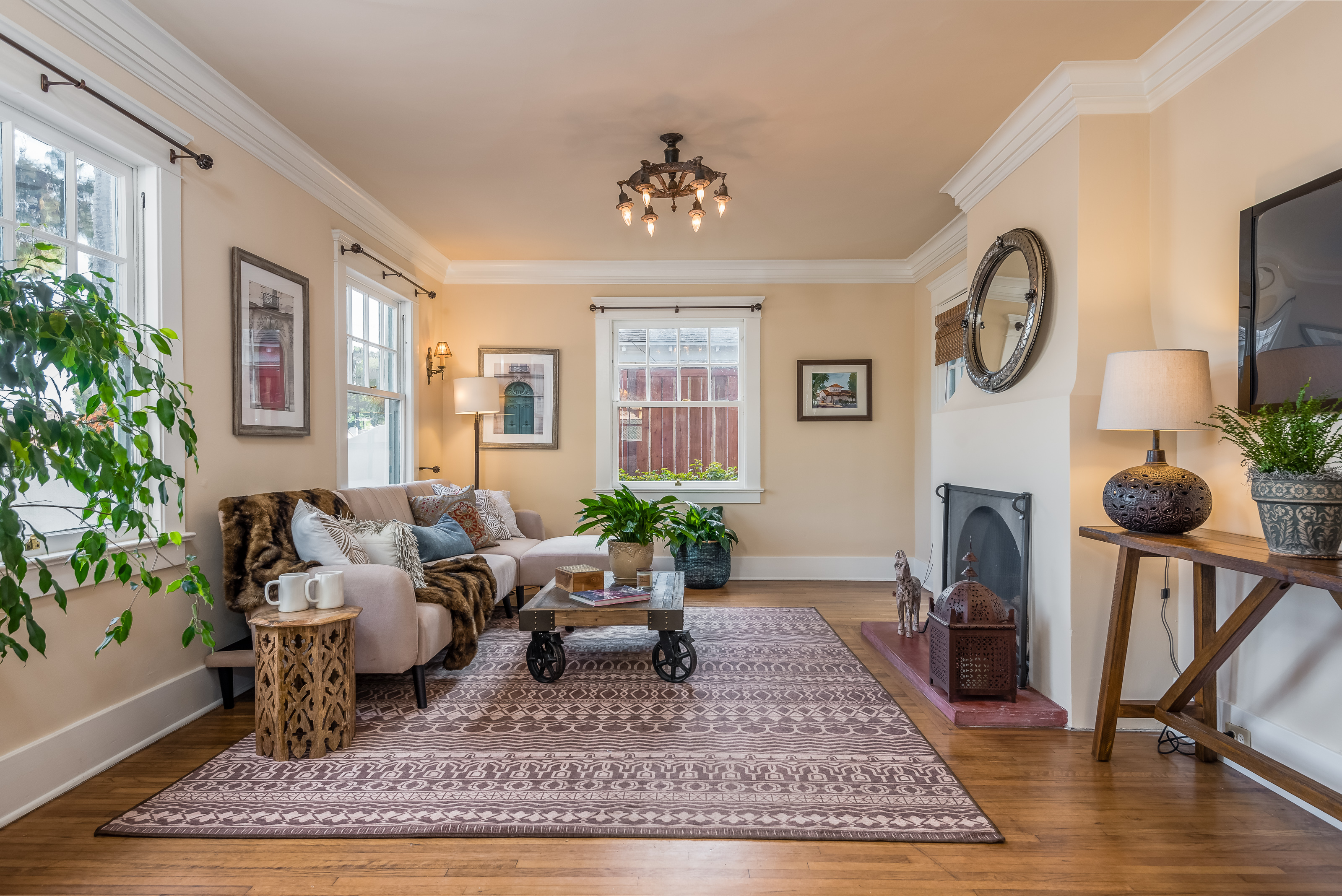 Aptly dubbed “La Casa Que Canta” by its owners who’ve loved it for almost twenty years, this little jewel built in 1924 is even more adorable when you walk through the front door. The interior offers all the authentic details I had hoped for. Crown molding, original casement windows, and period lighting fixtures grace every room. Original hardwood floors gleam throughout, except in the bathroom and kitchen, which sport distinctive tile instead.