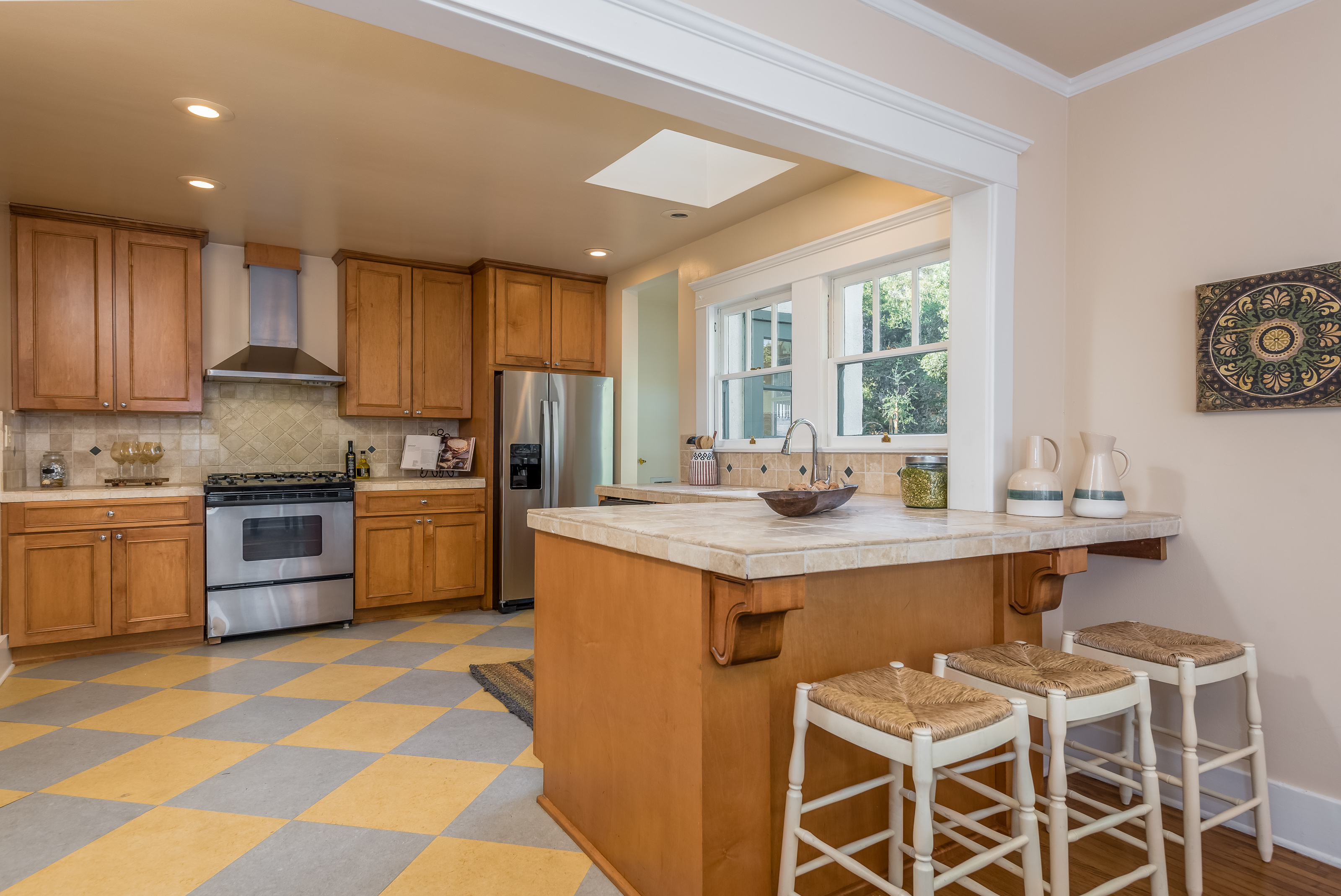 A wide breakfast bar defines the edge of the kitchen, which is spacious enough for collaborative cookin, and sure to be a gathering place. Stainless steel appliances, solid wood cabinetry, and newer tilework provide a classy backdrop, while a skylight and double windows over the sink provide ample light and a view. An adjacent alcove houses the laundry room and provides a convenient side exit.