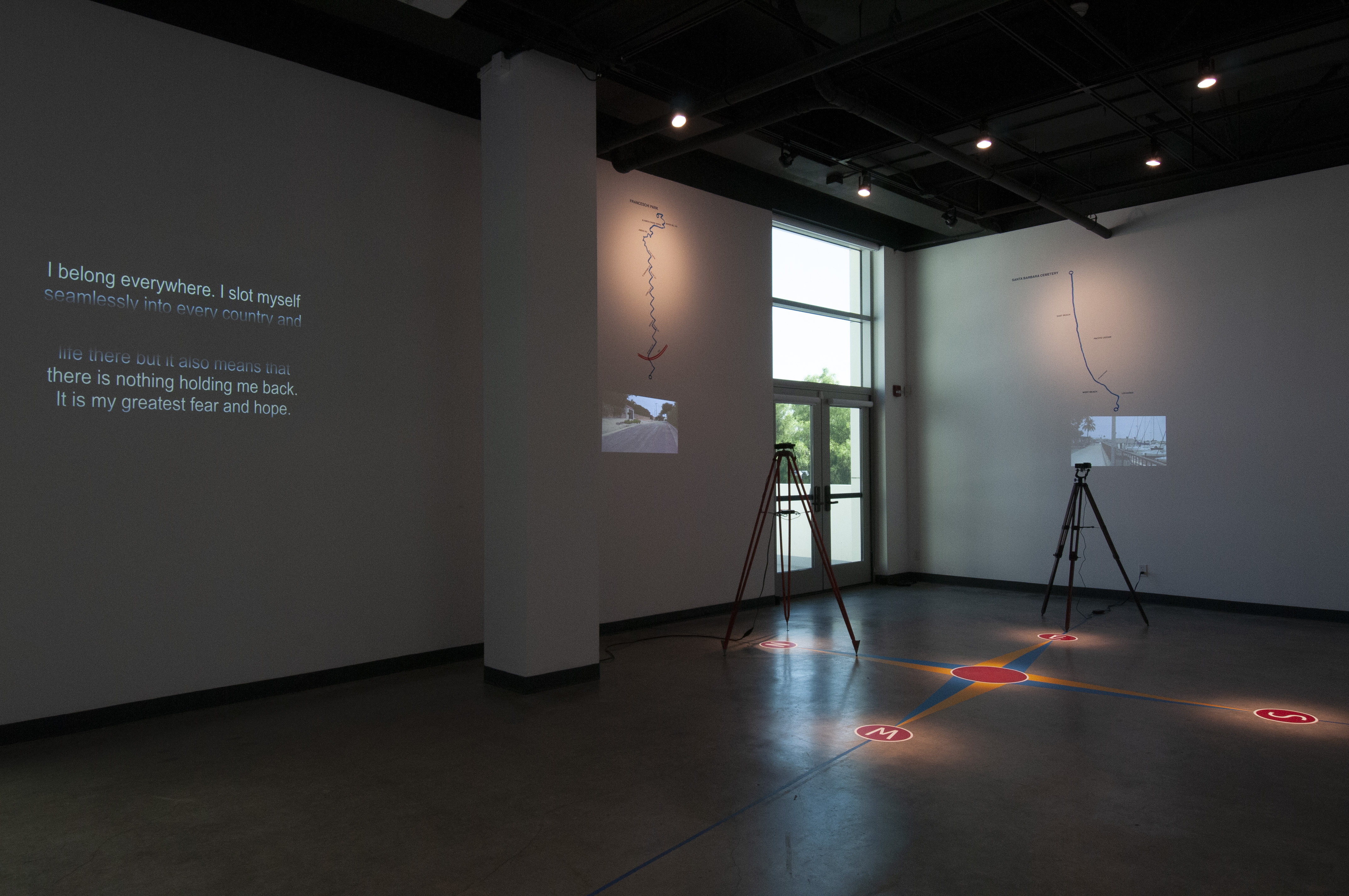 West Is South, her new exhibition at the Atkinson Gallery at SBCC, may be her most resonant work yet, at least for those of us living here in Santa Barbara. Inspired by the eerie sense of dislocation she felt standing at the compass rose on the end of Stearns Wharf, West Is South takes as its point of departure the fact that in Santa Barbara, looking straight out into the Pacific Ocean means facing south, not west. Out of this geographic anomaly, which is unique to our area out of the whole west coast of North America, Mulfinger has crafted an exhibition that stimulates viewers to get in touch with this peculiarity of our region through their bodies, while at the same time asking them to put into words what it means to feel as though they belong somewhere.