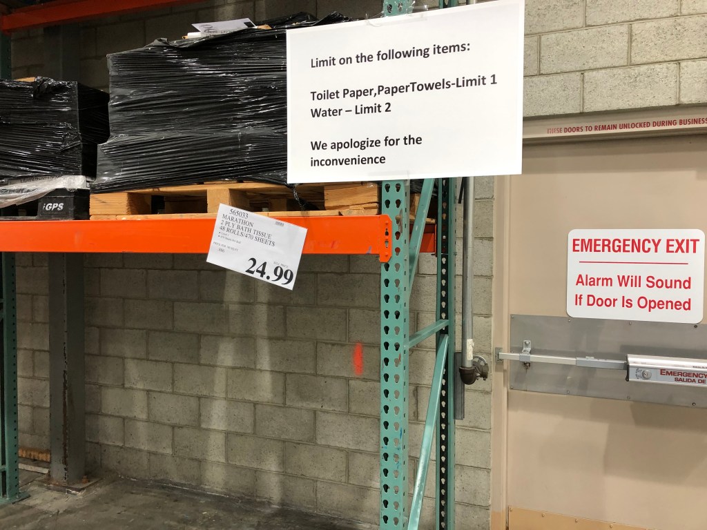 “We counted a thousand people waiting this morning,” a Costco employee said as he paused while wheeling a hand truck past racks that were emptied of the toilet paper and bottled water they’d held at 9:30 that morning. At Smart & Final, which opens at 6 a.m., toilet paper was gone by eight o’clock.