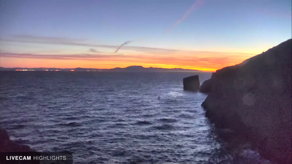 There was no one in the Sauces Canyon bald eagle nest when I peeked in, but it was amazing to see their cozy abode from high in the tree, the wind whistling through my speakers. The Anacapa Island Peregrine Falcon cam was also raptor-free the moment I virtually popped round, but the view of the bay and sound of seagulls was lulling and lovely. The Anacapa Cove cam faces north toward the mainland shore and offered serenity as I saw the sun glow orange-red over the mountains and the lights of the city twinkle and heard a foghorn’s lowing mixed with the cacophony of seagull calls.